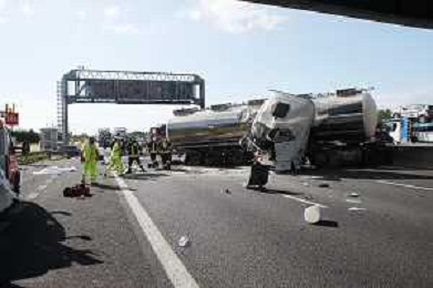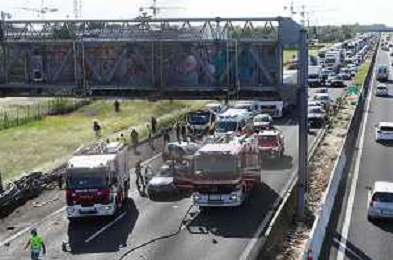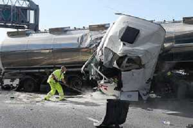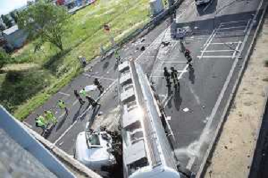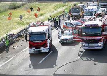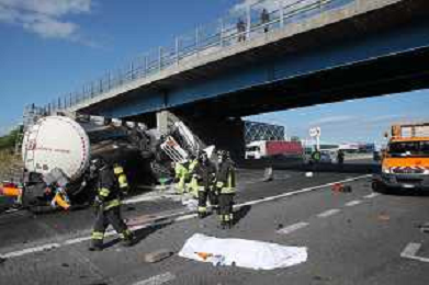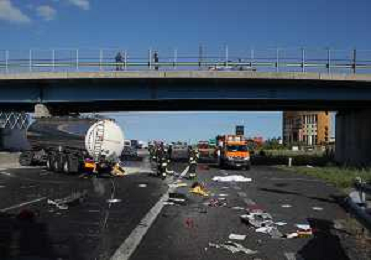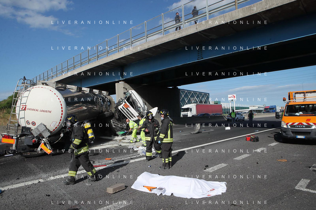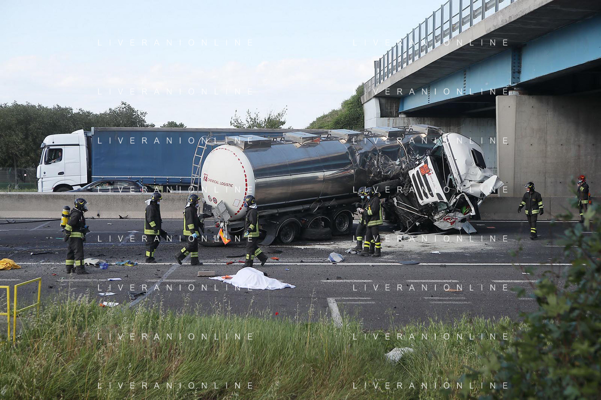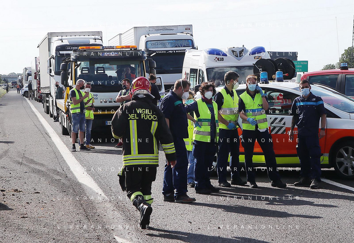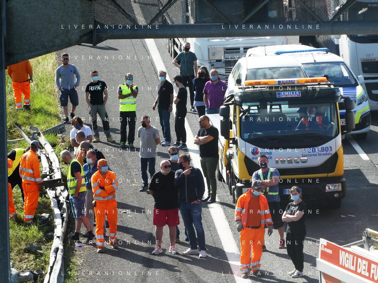 IMOLA 25 05 2021 AUTOSTRADA A14 INCIDENTE STRADALE MORTALE KM 49 CAMION PERDE IL CONTROLLO E SI SCHIANTA CONTRO GUARD RAIL E SI FERMA SOTTO IL CAVALCAVIA SUL POSTO 118 VIGILI DEL FUOCO POLIZIA STRADALE
