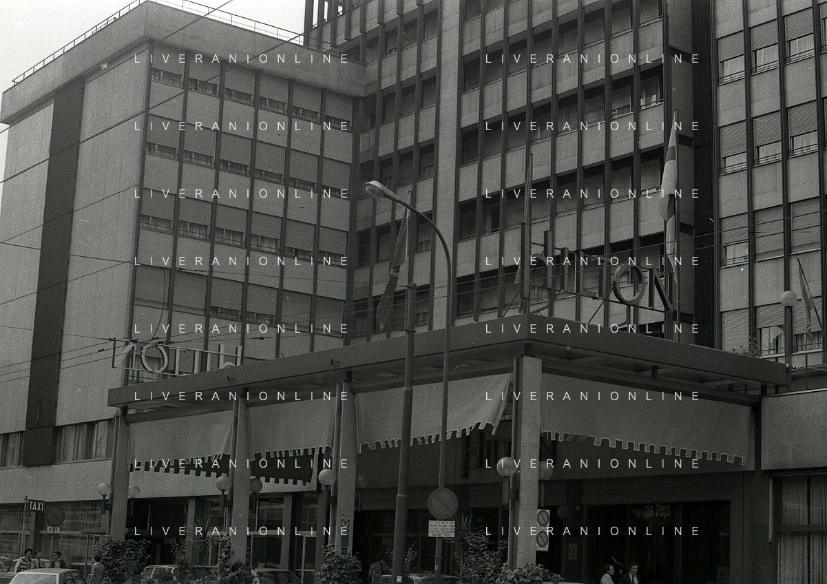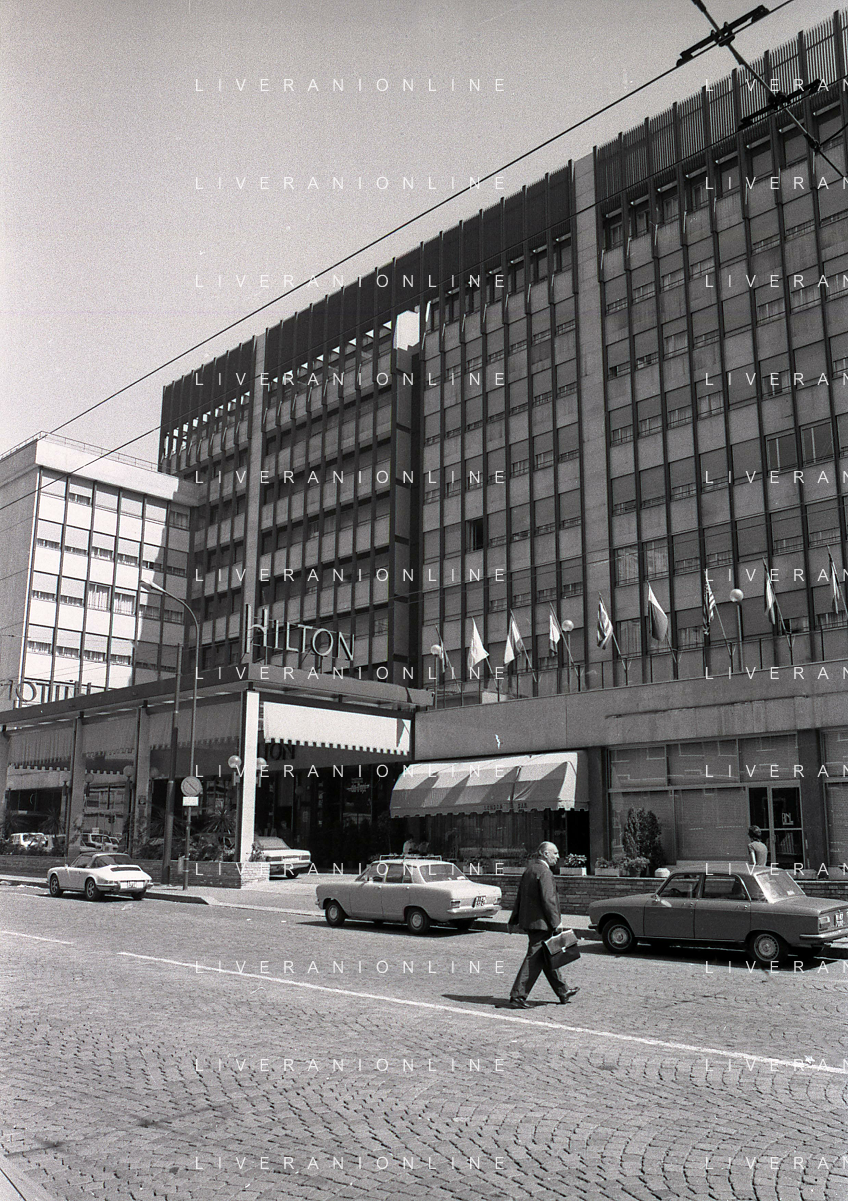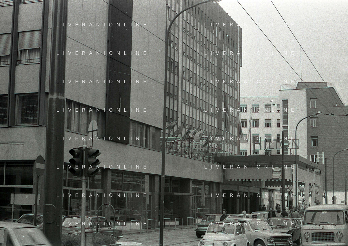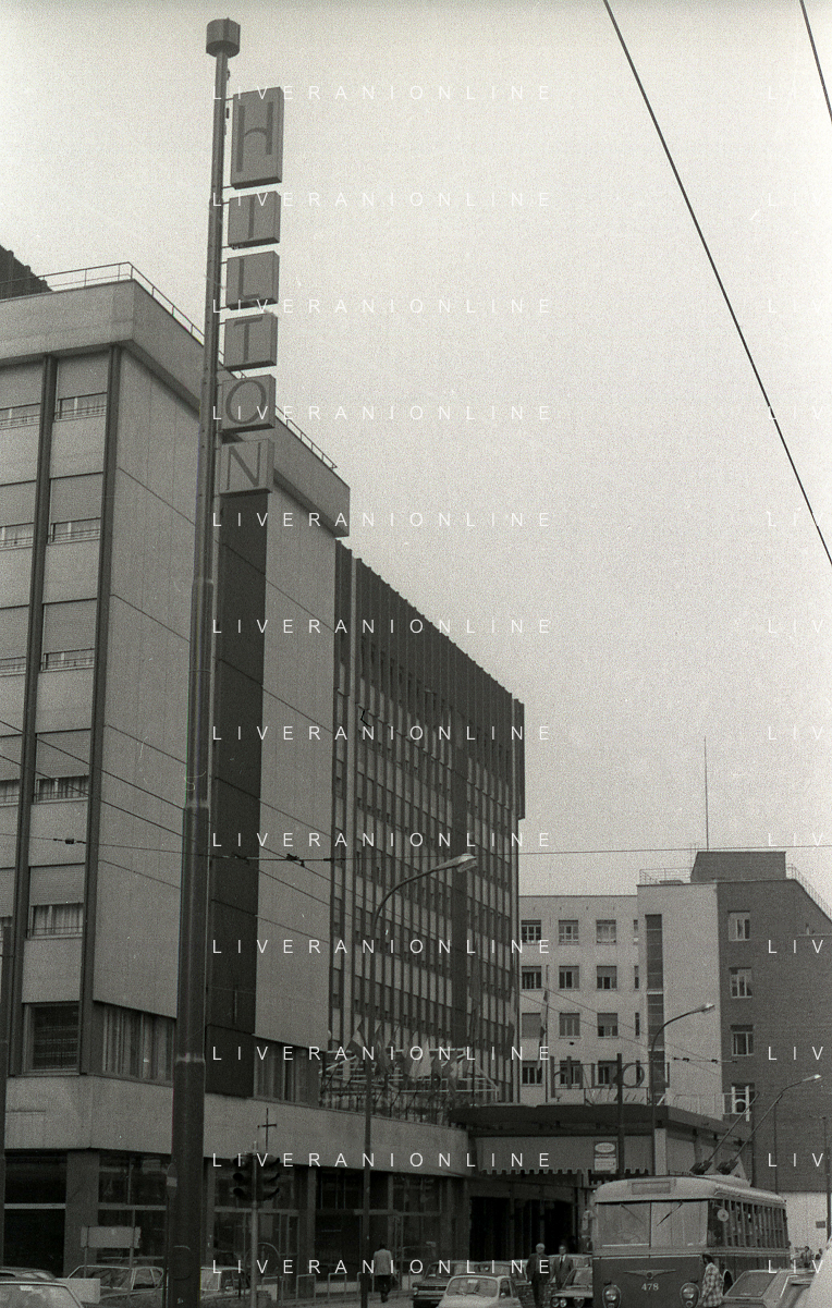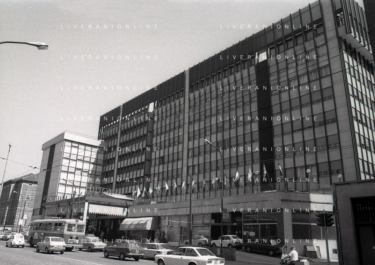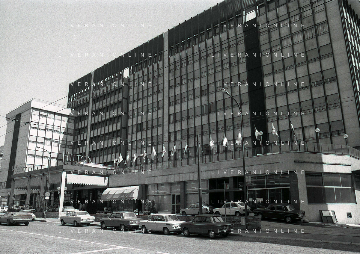 1973 MILANO HOTEL HILTON SEDE DEL CALCIO MERCATO NELLA FOTO ESTERNI E INTERNI HOTEL HILTON DI VIA GALVANI DOVE SI SVOLGERA' IL CALCIO MERCATO AG ALDO LIVERANI SAS