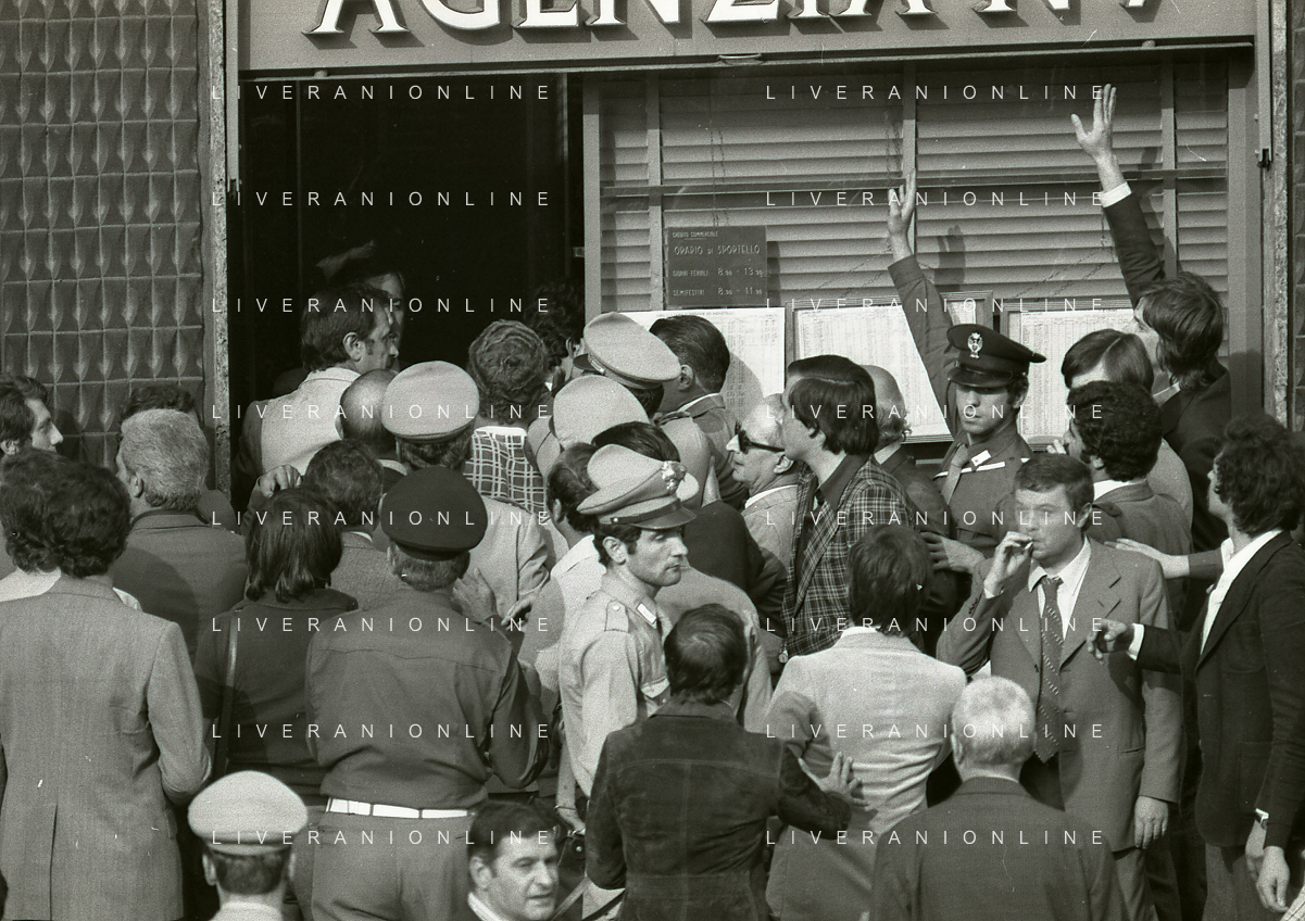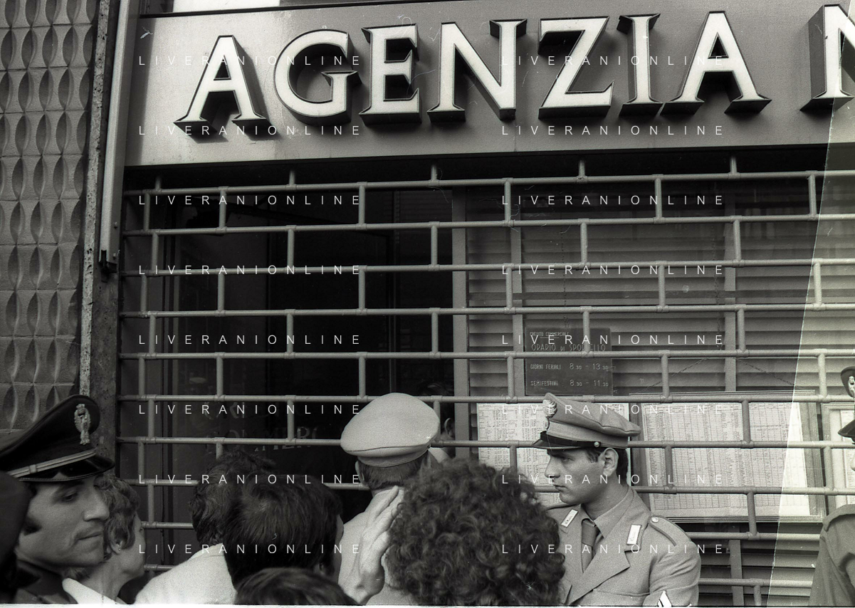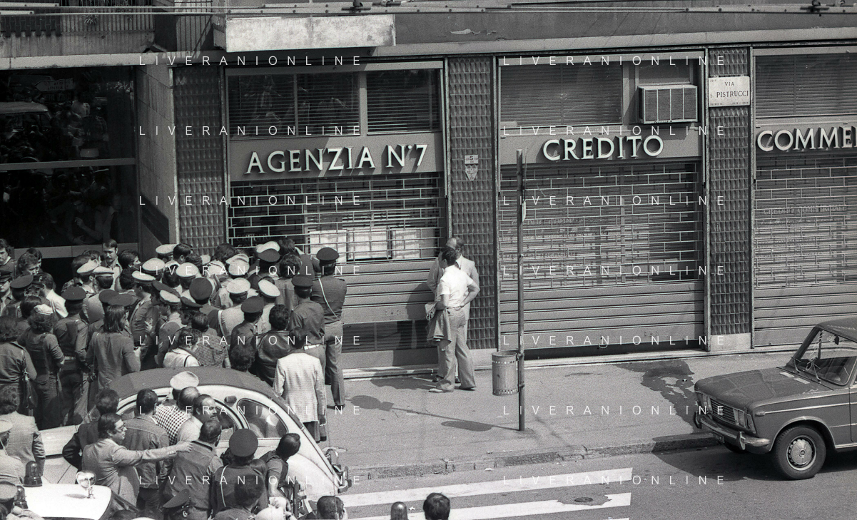 08-09-1975 MILANO RAPINA ALLA BANCA CREDITO COMMERCIALE IN PIAZZA INSUBRIA NELLA FOTO LA BANCA COMMERCIALE IN PIAZZA INSUBRIA RAPINATA DA DUE MALVIVENTI CHE PRESERO IN OSTAGGIO DEI CLIENTI E IL DIRETTORE DELLA BANCA, POI VENNERRO ARRESTATI PIU' TARDI. AG ALDO LIVERANI SAS