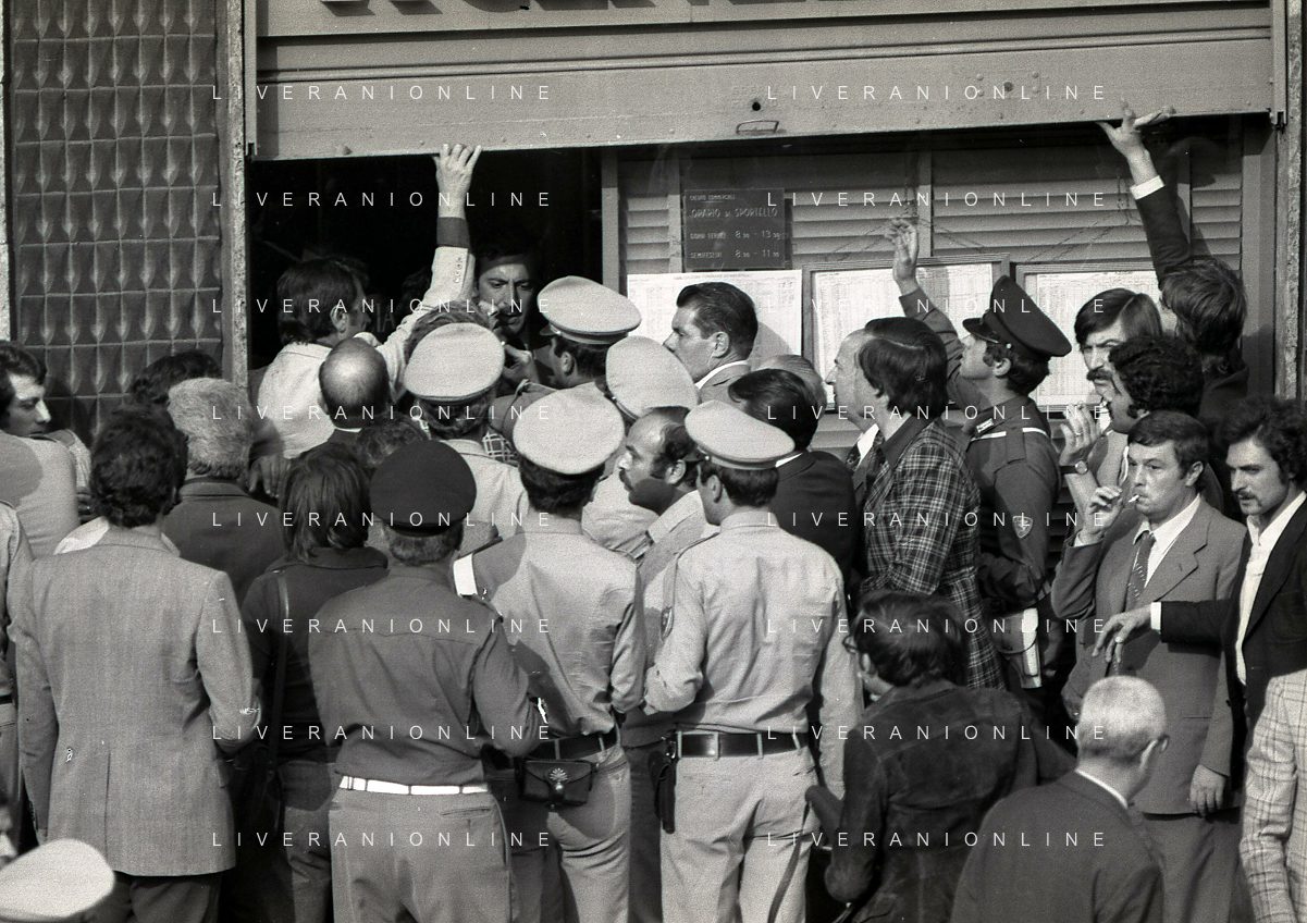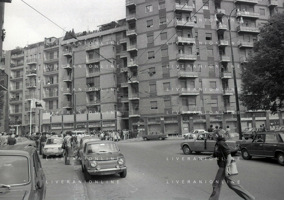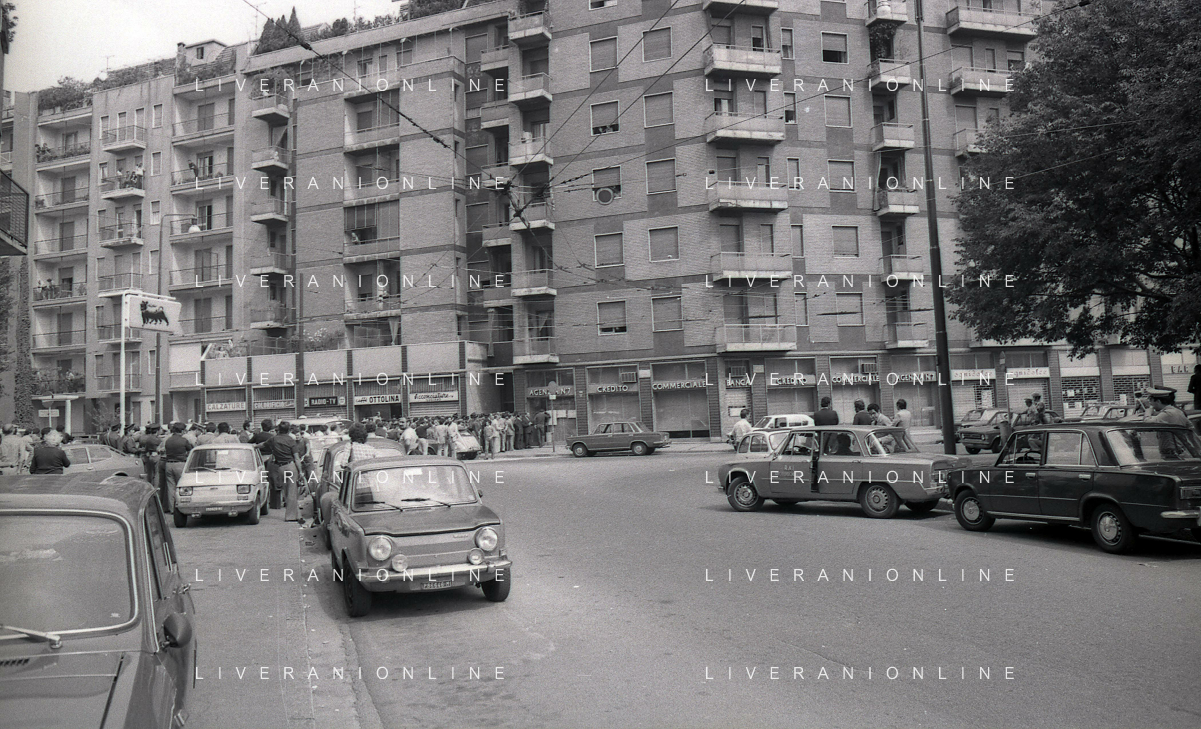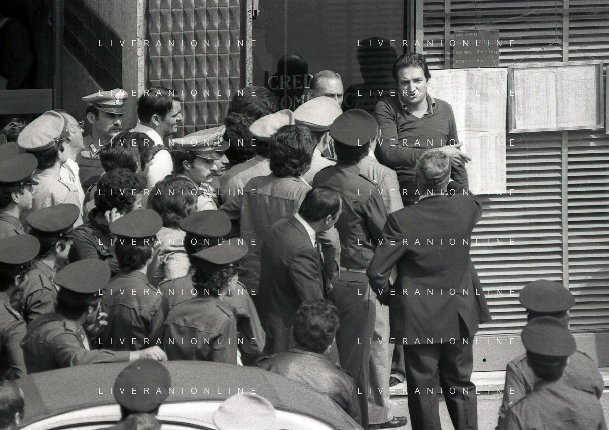 08-09-1975 MILANO RAPINA ALLA BANCA CREDITO COMMERCIALE IN PIAZZA INSUBRIA NELLA FOTO LA BANCA COMMERCIALE IN PIAZZA INSUBRIA RAPINATA DA DUE MALVIVENTI CHE PRESERO IN OSTAGGIO DEI CLIENTI E IL DIRETTORE DELLA BANCA, POI VENNERRO ARRESTATI PIU' TARDI. AG ALDO LIVERANI SAS