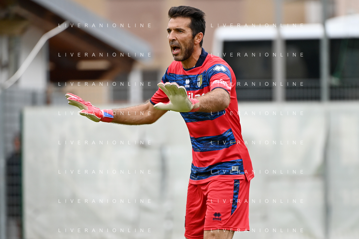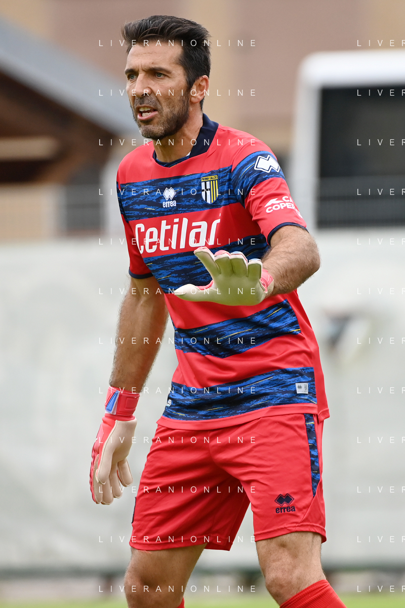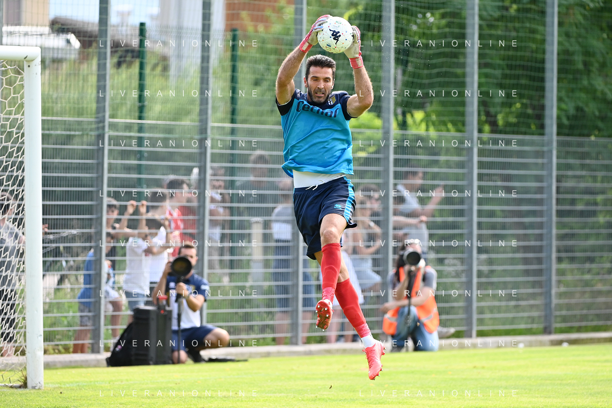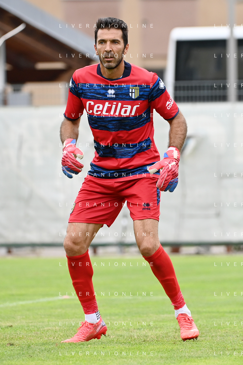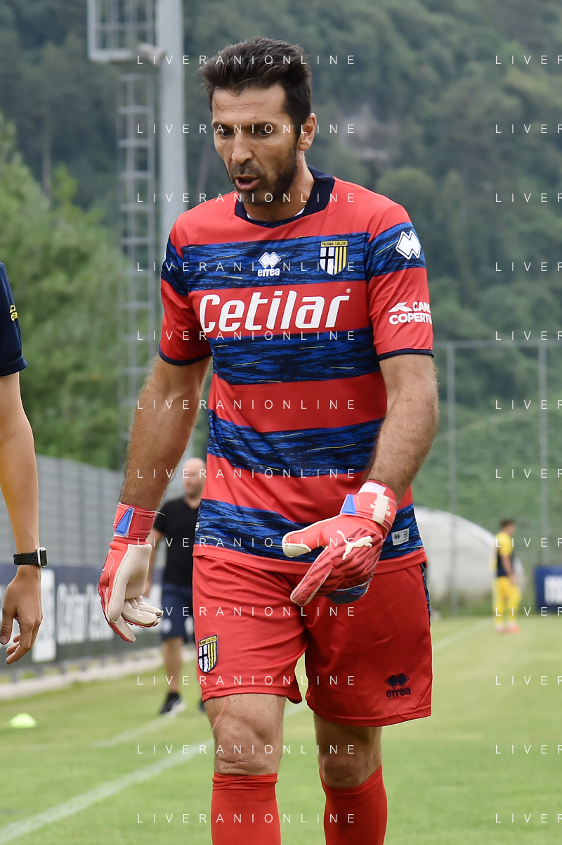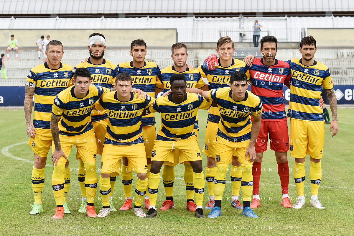 la formazione del Parma da SX Juraj Kucka, Simon Sohm, Botond Balogh, Riccardo Gagliolo, Adrian Benedyczak, Gianluigi Buffon e Stanko Juric; in basso da SX Lautaro Valenti, Daniele Iacoponni, Drissa Camara e Juan Francisco Brunetta Parma vs Trento amichevole precampionato San Michele all'Adige 24-07-2021 foto Roberto Garavaglia/ag. Aldo Liverani sas