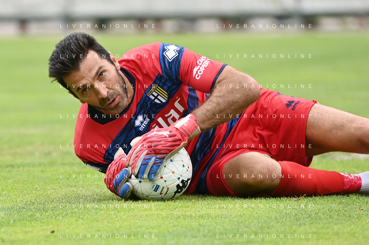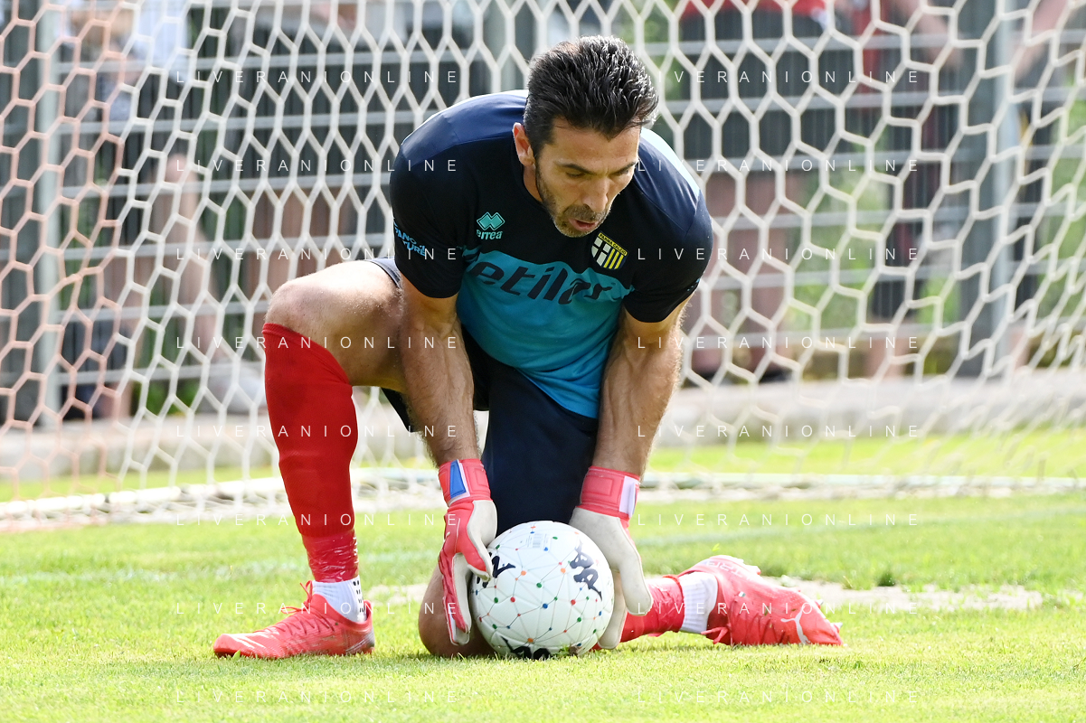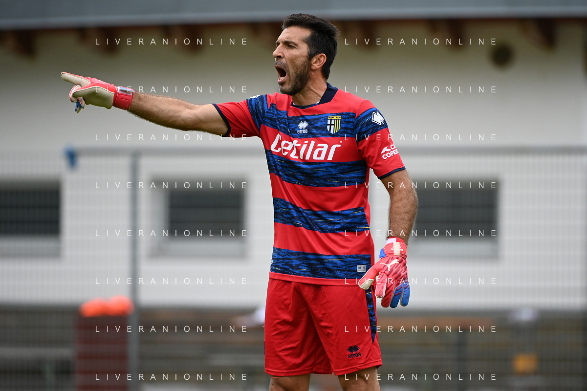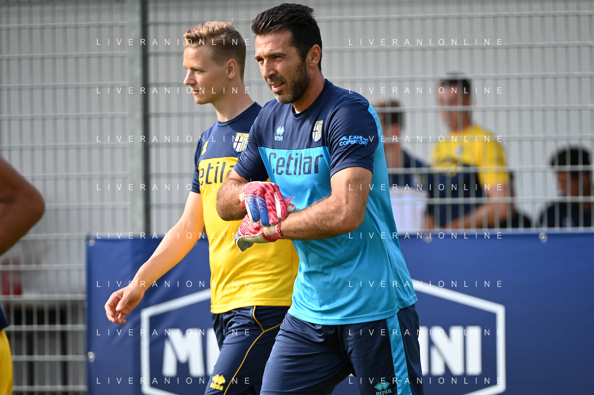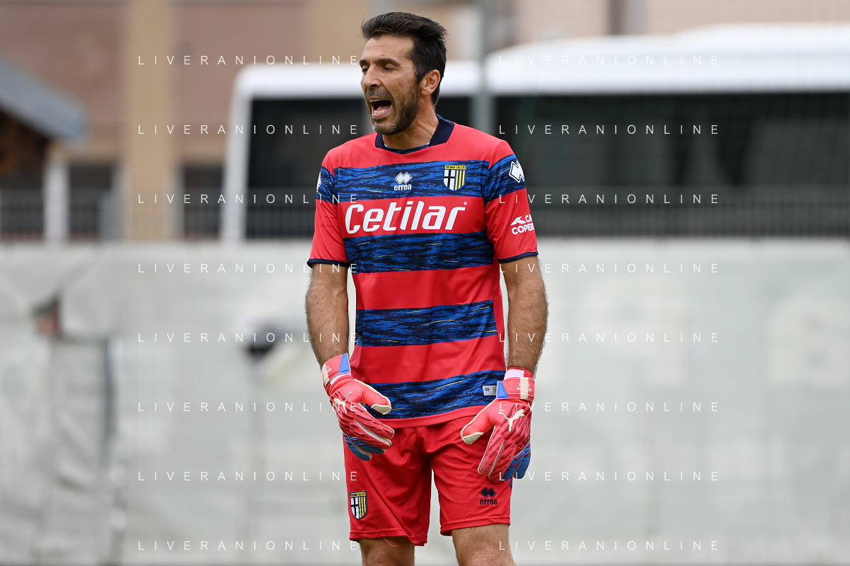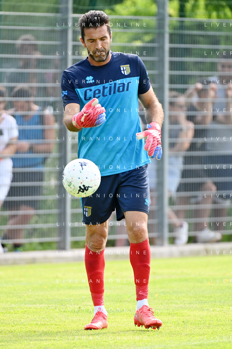 la formazione del Parma da SX Juraj Kucka, Simon Sohm, Botond Balogh, Riccardo Gagliolo, Adrian Benedyczak, Gianluigi Buffon e Stanko Juric; in basso da SX Lautaro Valenti, Daniele Iacoponni, Drissa Camara e Juan Francisco Brunetta Parma vs Trento amichevole precampionato San Michele all'Adige 24-07-2021 foto Roberto Garavaglia/ag. Aldo Liverani sas