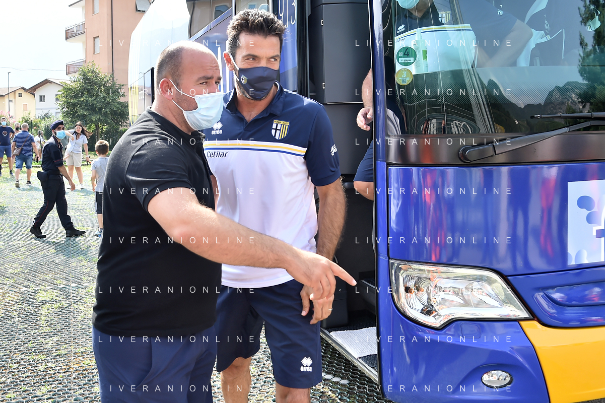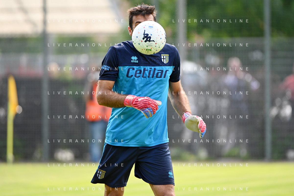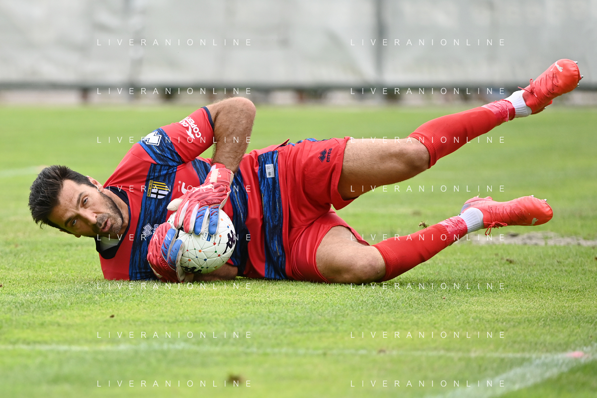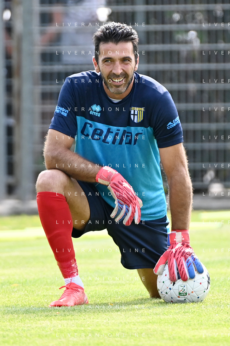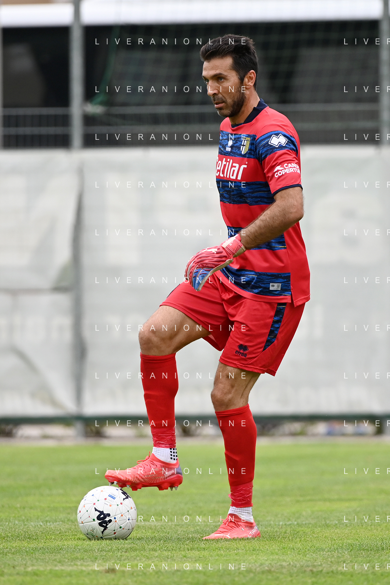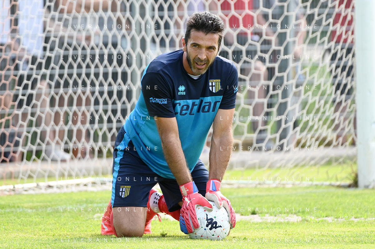 la formazione del Parma da SX Juraj Kucka, Simon Sohm, Botond Balogh, Riccardo Gagliolo, Adrian Benedyczak, Gianluigi Buffon e Stanko Juric; in basso da SX Lautaro Valenti, Daniele Iacoponni, Drissa Camara e Juan Francisco Brunetta Parma vs Trento amichevole precampionato San Michele all'Adige 24-07-2021 foto Roberto Garavaglia/ag. Aldo Liverani sas