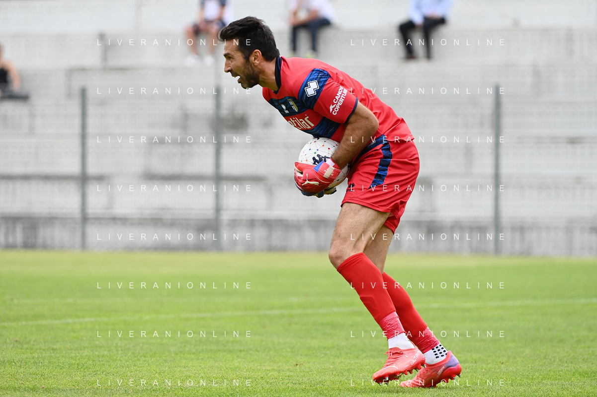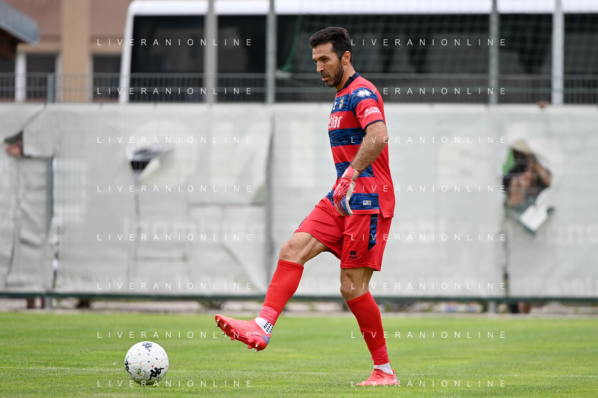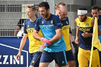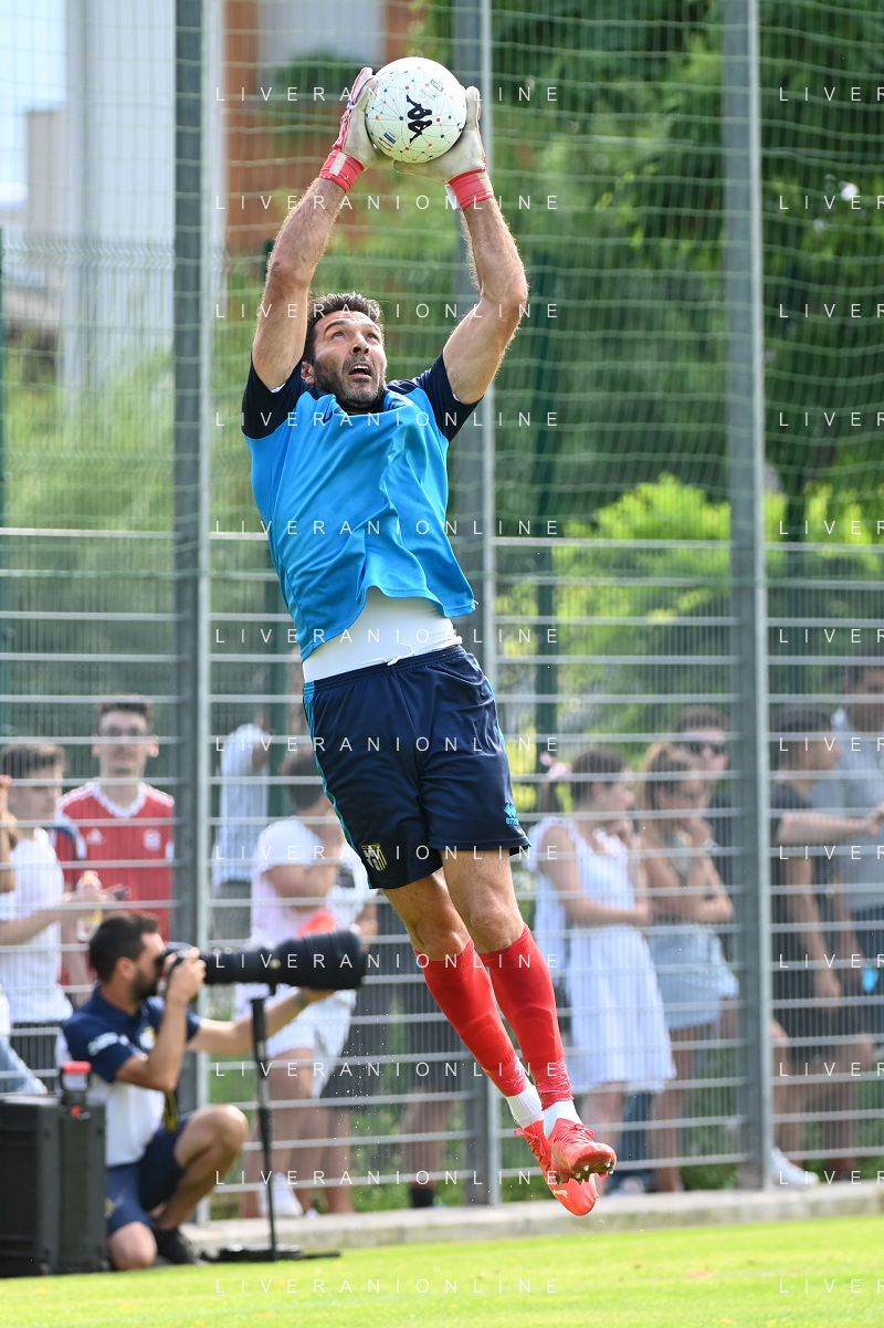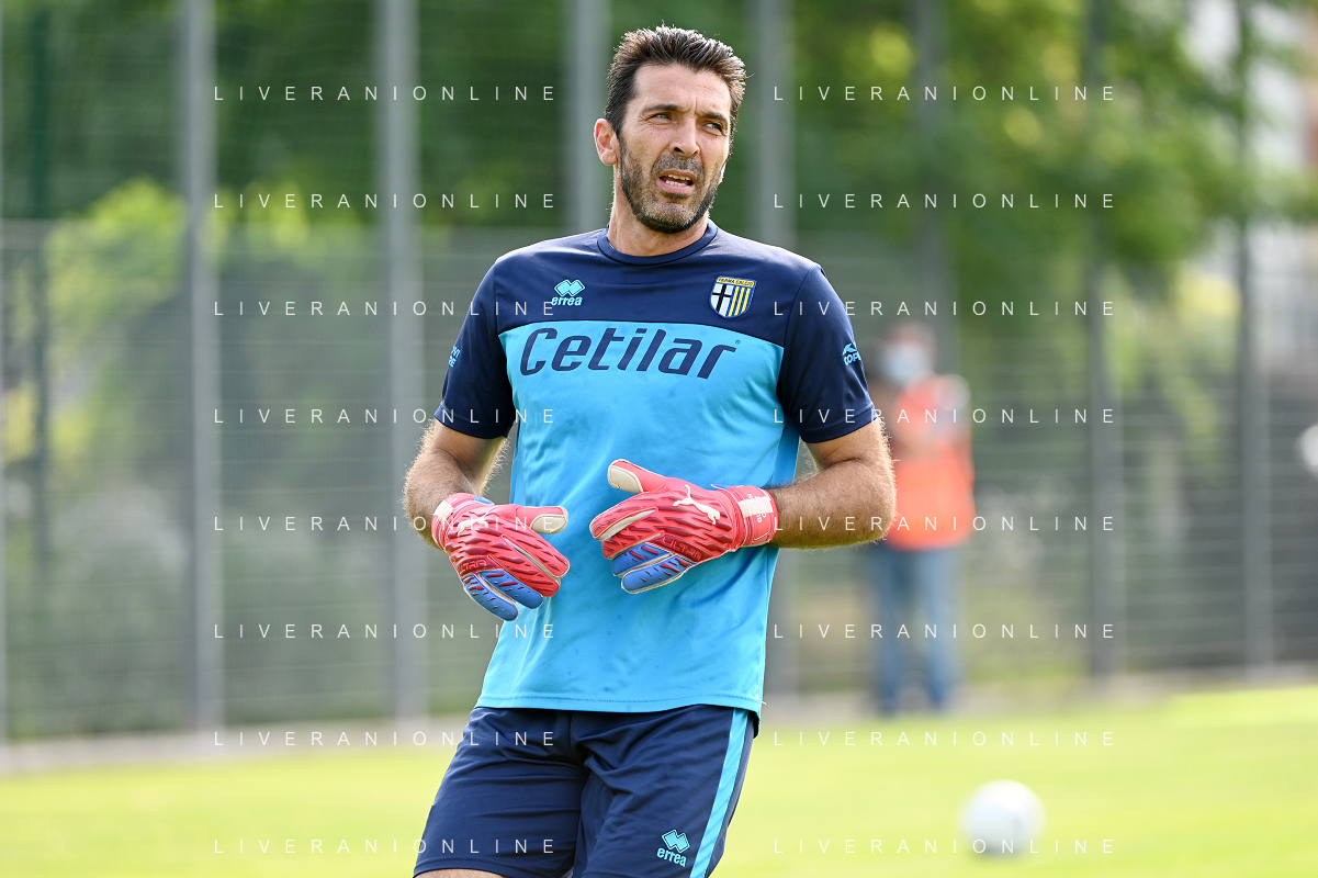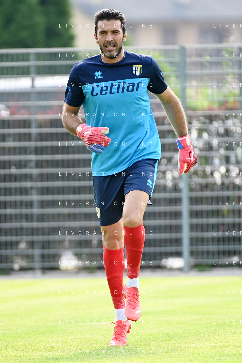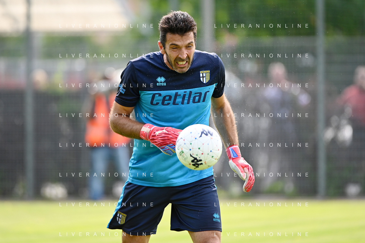 la formazione del Parma da SX Juraj Kucka, Simon Sohm, Botond Balogh, Riccardo Gagliolo, Adrian Benedyczak, Gianluigi Buffon e Stanko Juric; in basso da SX Lautaro Valenti, Daniele Iacoponni, Drissa Camara e Juan Francisco Brunetta Parma vs Trento amichevole precampionato San Michele all'Adige 24-07-2021 foto Roberto Garavaglia/ag. Aldo Liverani sas