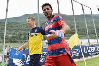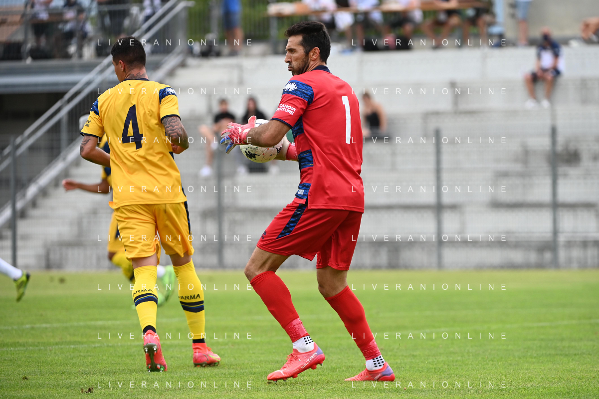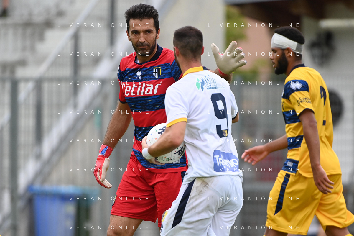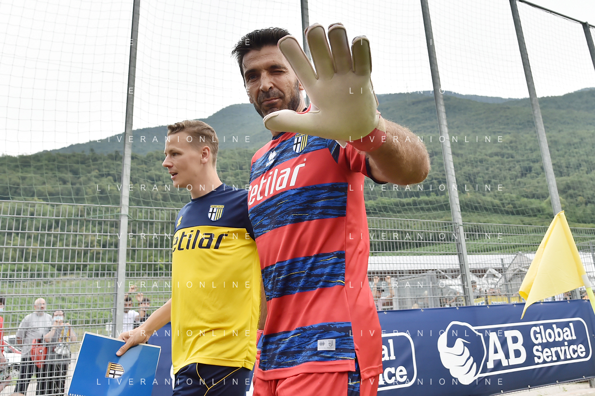 Gianlugi Buffon (Parma) e Riccardo Barbuti (Trento) dopo il gol dell'1 a 1 Parma vs Trento amichevole precampionato San Michele all'Adige 24-07-2021 foto Roberto Garavaglia/ag. Aldo Liverani sas