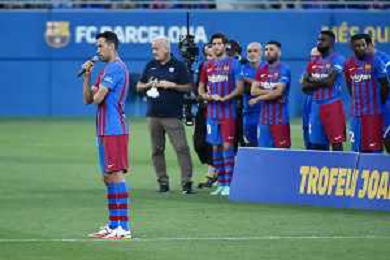 Sergio Busquets capitano del Barcellona ha salutato Lionel Messi durante la presentazione della squadra Barcellona vs Juventus - Trofeo Gamper amichevole precampionato Barcellona (SPA) 08-08-2021 Stadio Johan Cruijff foto Roberto Garavaglia/ag. Aldo Liverani sas