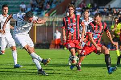 FagioliniF/LMedia - Lucchese vs Cesena - Campionato di Calcio Serie C - Lega Pro 2021/2022 05 settembre 2021 - Stadio Porta Elisa, Lucca, Italia Nella foto: Salvatore Caturano (Cesena) chiuso tra Marco Bellich (Lucchese) e Marco Baldan (Lucchese) @FagioliniF/LMedia/AGENZIA ALDO LIVERANI SAS