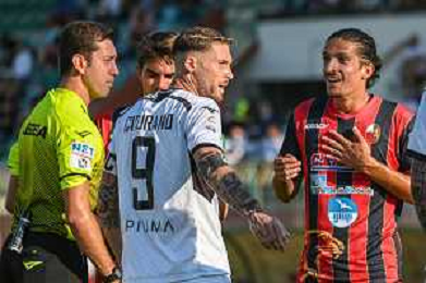 FagioliniF/LMedia - Lucchese vs Cesena - Campionato di Calcio Serie C - Lega Pro 2021/2022 05 settembre 2021 - Stadio Porta Elisa, Lucca, Italia Nella foto: Arbitro Sig. Alberto Ruben Arena ammonisce Cosimo Nannini (Lucchese) @FagioliniF/LMedia/AGENZIA ALDO LIVERANI SAS