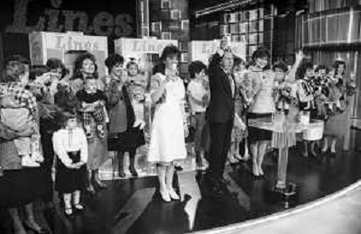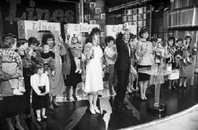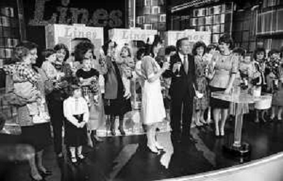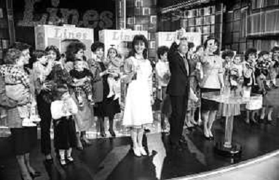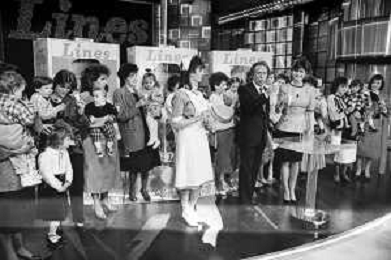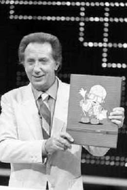 PENTATLON gioco televisivo a premi, trasmesso su Canale 5 nel 1986, condotto da Mike Bongiorno Nella foto con il ventriloquo jose' luis moreno con il pupazzo macario e la cantante francese Mireille Mathieu ©Archivio Giovanni Liverani / AGENZIA ALDO LIVERANI SAS