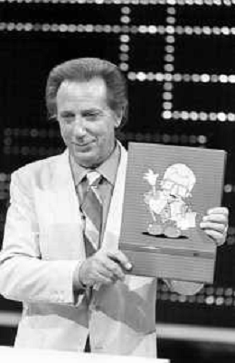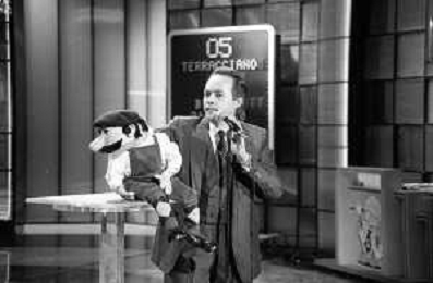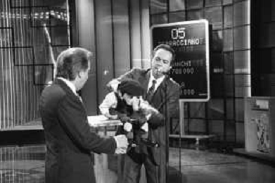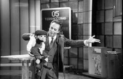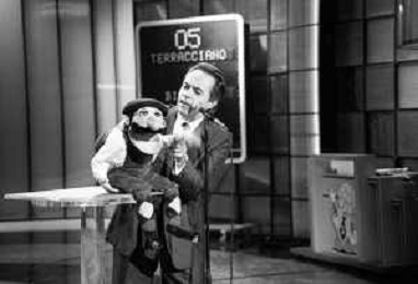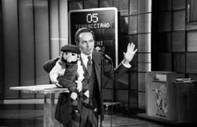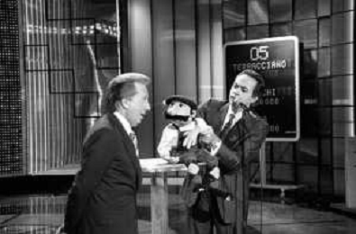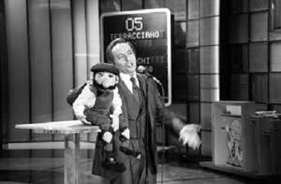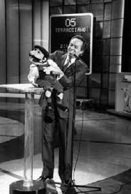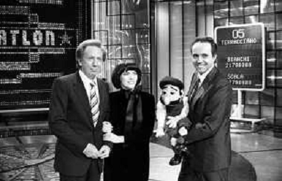 PENTATLON gioco televisivo a premi, trasmesso su Canale 5 nel 1986, condotto da Mike Bongiorno Nella foto con il ventriloquo jose' luis moreno con il pupazzo macario ©Archivio Giovanni Liverani / AGENZIA ALDO LIVERANI SAS