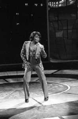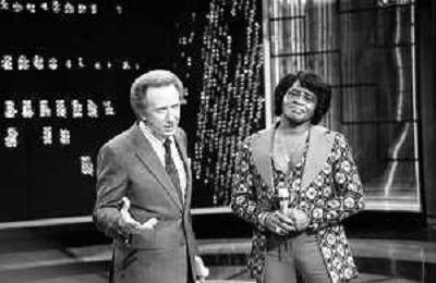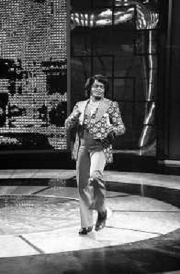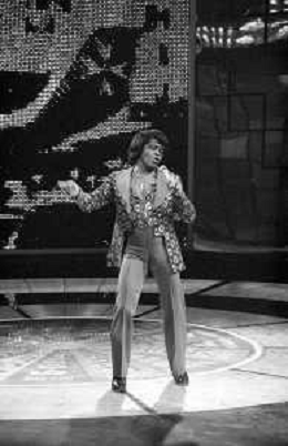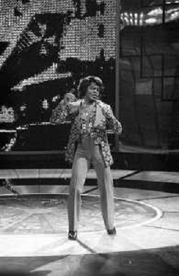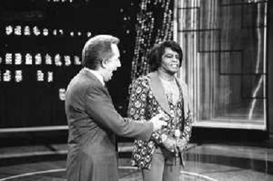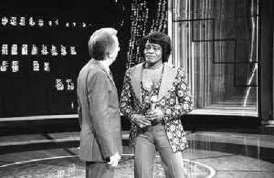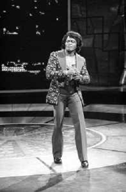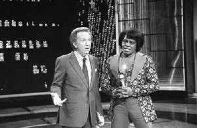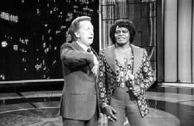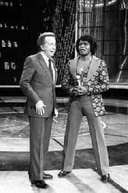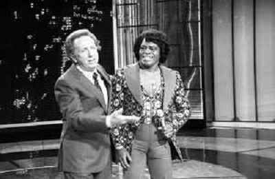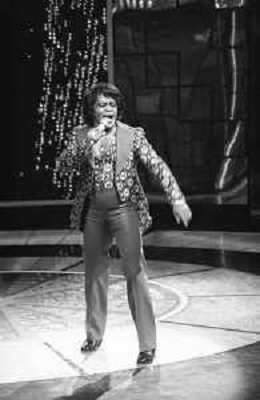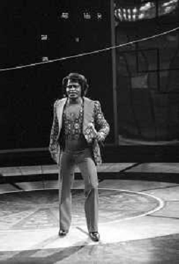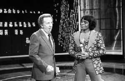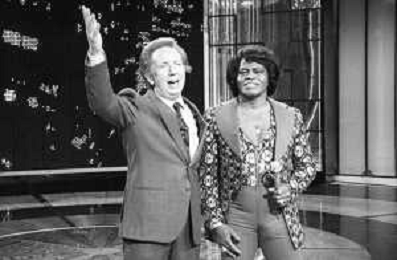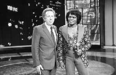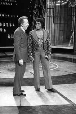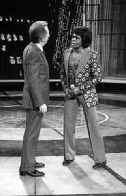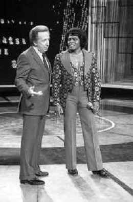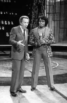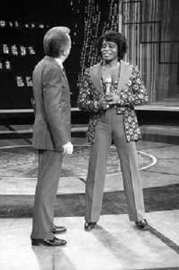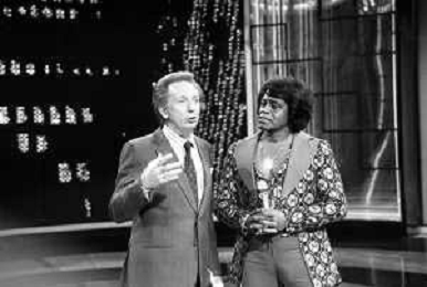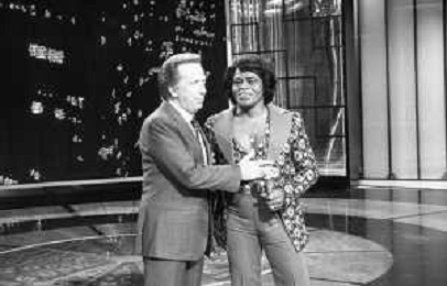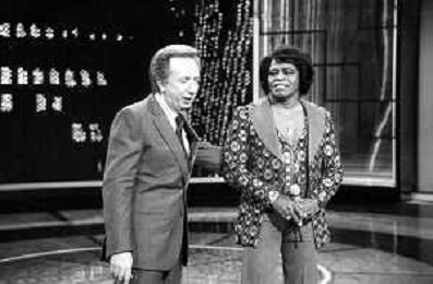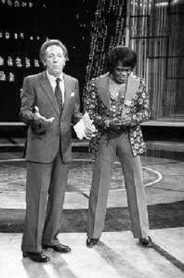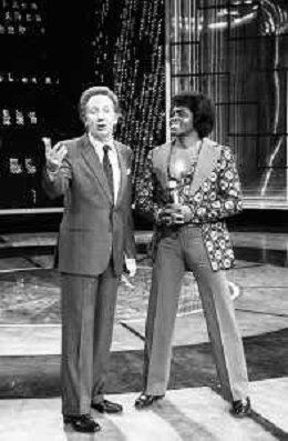 PENTATLON gioco televisivo a premi, trasmesso su Canale 5 nel 1986, condotto da Mike Bongiorno Nella foto con il cantante e ballerino statunitense James Brown ©Archivio Giovanni Liverani / AGENZIA ALDO LIVERANI SAS
