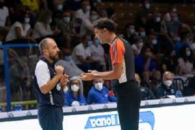 CasoniM/LMedia - Vanoli Basket Cremona VS Banco di Sardegna Sassari - Basket Supercoppa Italiana 10 settembre 2021 - Pala Radi, Cremona, Italia Nella foto: CAVINA Demis (Banco di Sardegna Sassari) a colloquio con un arbitro @CasoniM/LMedia/ AGENZIA ALDO LIVERANI SAS