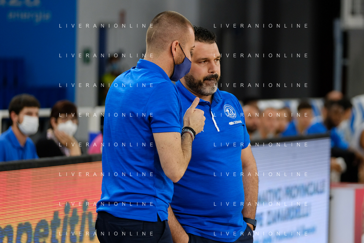 TommasiniR/LMedia - Germani Brescia VS GeVi Napoli - Basket Supercoppa Italiana 11 settembre 2021 - Pala Leonessa, Brescia, Italia Nella foto: John Petrucelli - Germani Basket Brescia and Piepaolo Marini - GeVi Napoli Basket @TommasiniR/LMedia AG ALDO LIVERANI SAS