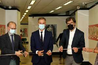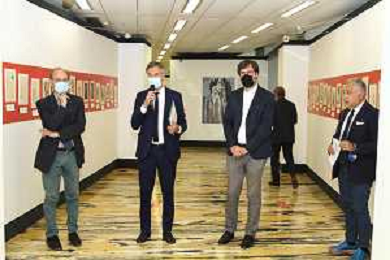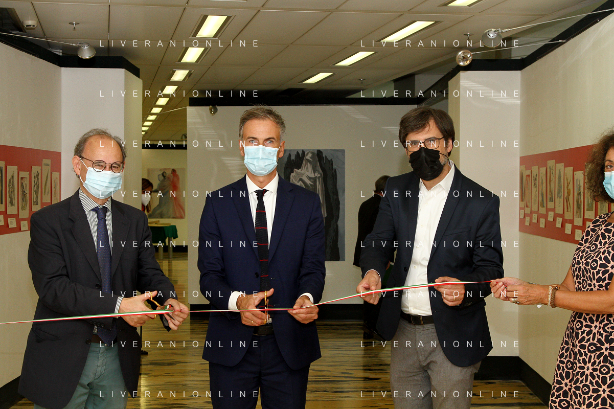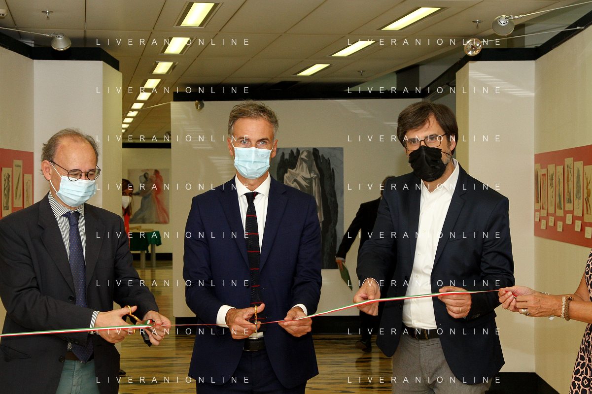 Milano ( MI ) 14/09/2021 Mostra in occasione del 700∞ anniversario dantesco: esposte a Palazzo Pirelli le 100 tavole originali con cui Salvador DalÌ ha illustrato la Divina Commedia Nella foto: Andrea Kerbaker, Alessandro Fermi e Borghetti al taglio del nastro PH Lauro Montagnini / AGENZIA ALDO LIVERANI SAS