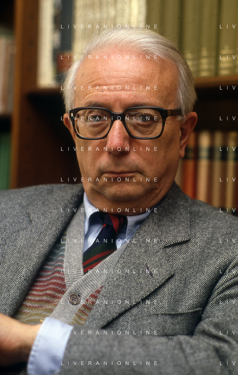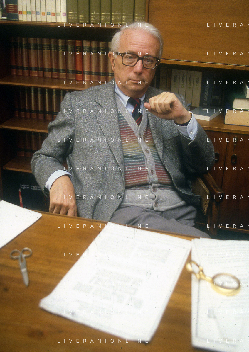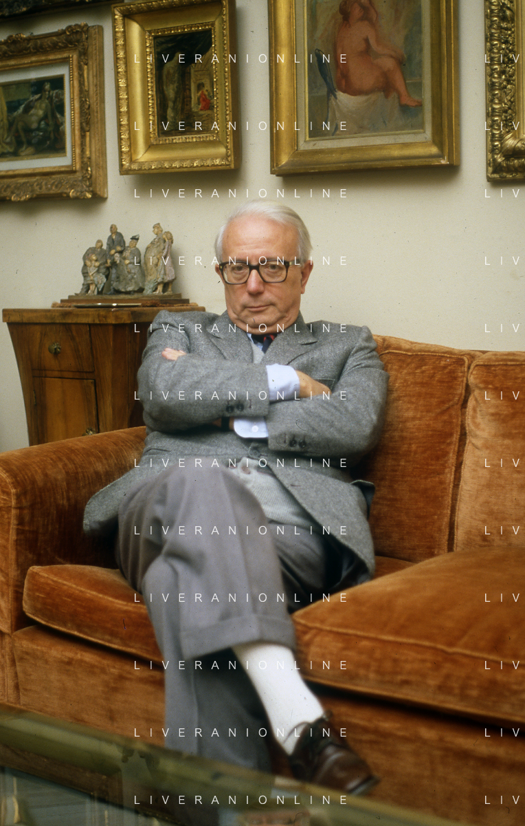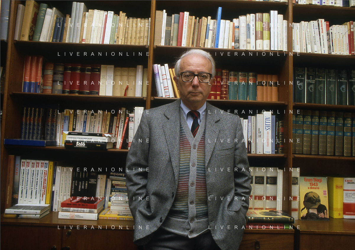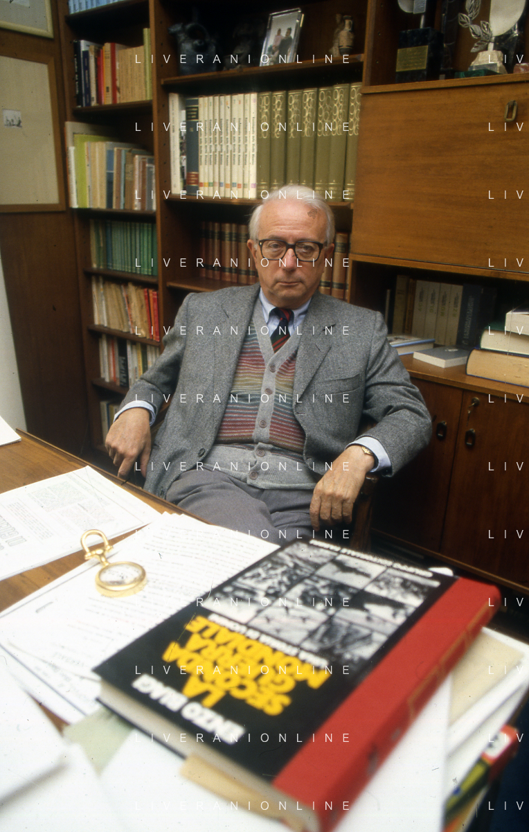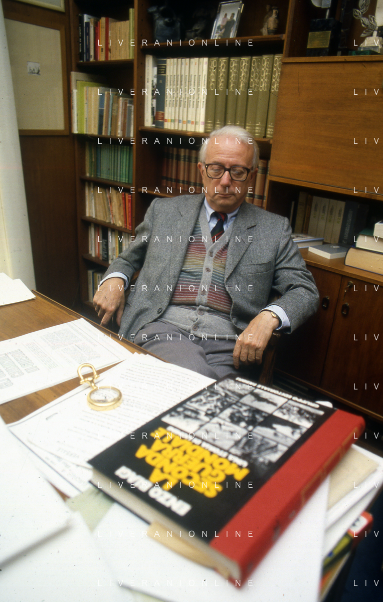 RETROSPETTIVA ENZO BIAGI GIORNALISTA E SCRITTORE E CONDUTTORE TELEVISIVO NELLA FOTO ENZO BIAGI NELLA SUA ABITAZIONE NELL'ANNO 1985 AG ALDO LIVERANI SAS