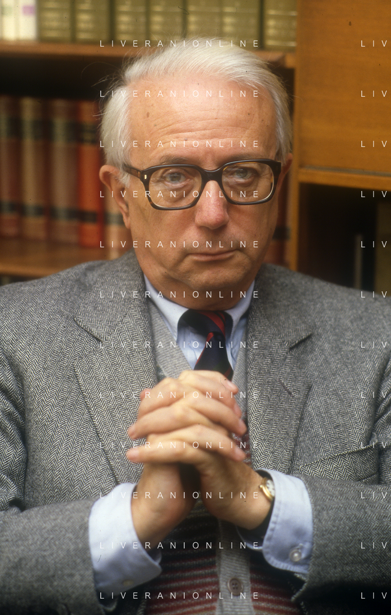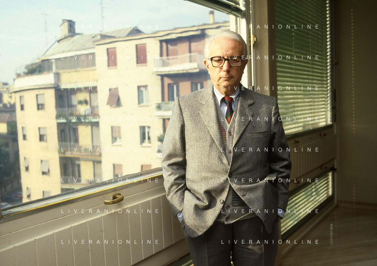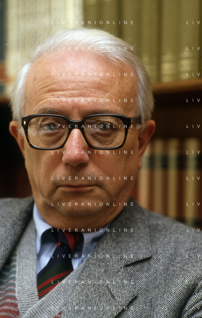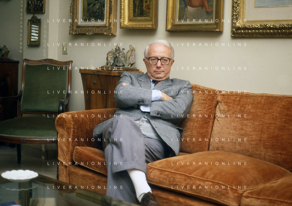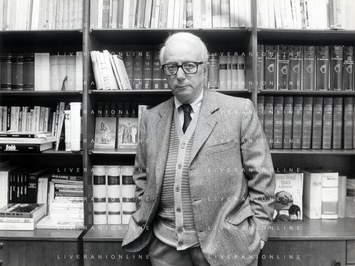 RETROSPETTIVA ENZO BIAGI GIORNALISTA E SCRITTORE E CONDUTTORE TELEVISIVO NELLA FOTO ENZO BIAGI NELLA SUA ABITAZIONE NELL'ANNO 1985 AG ALDO LIVERANI SAS