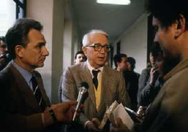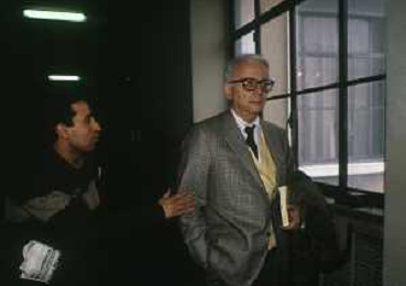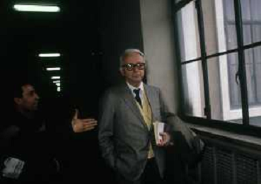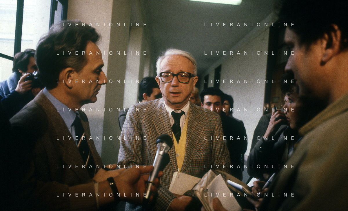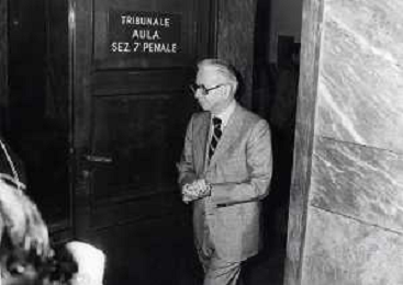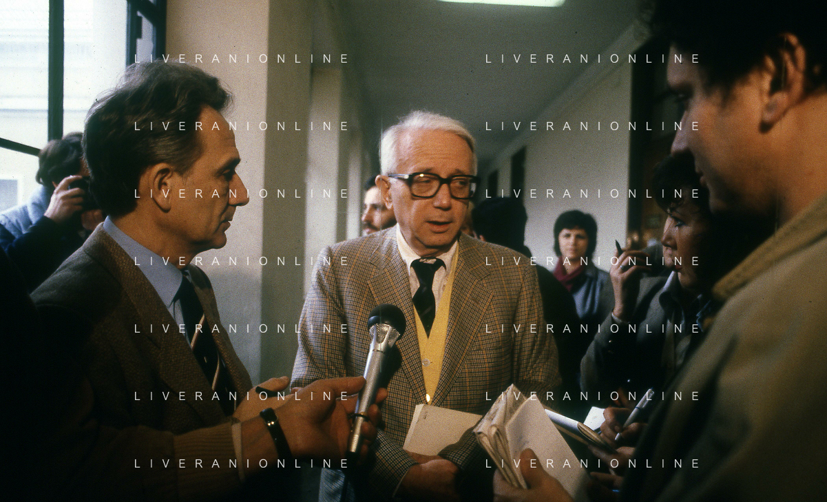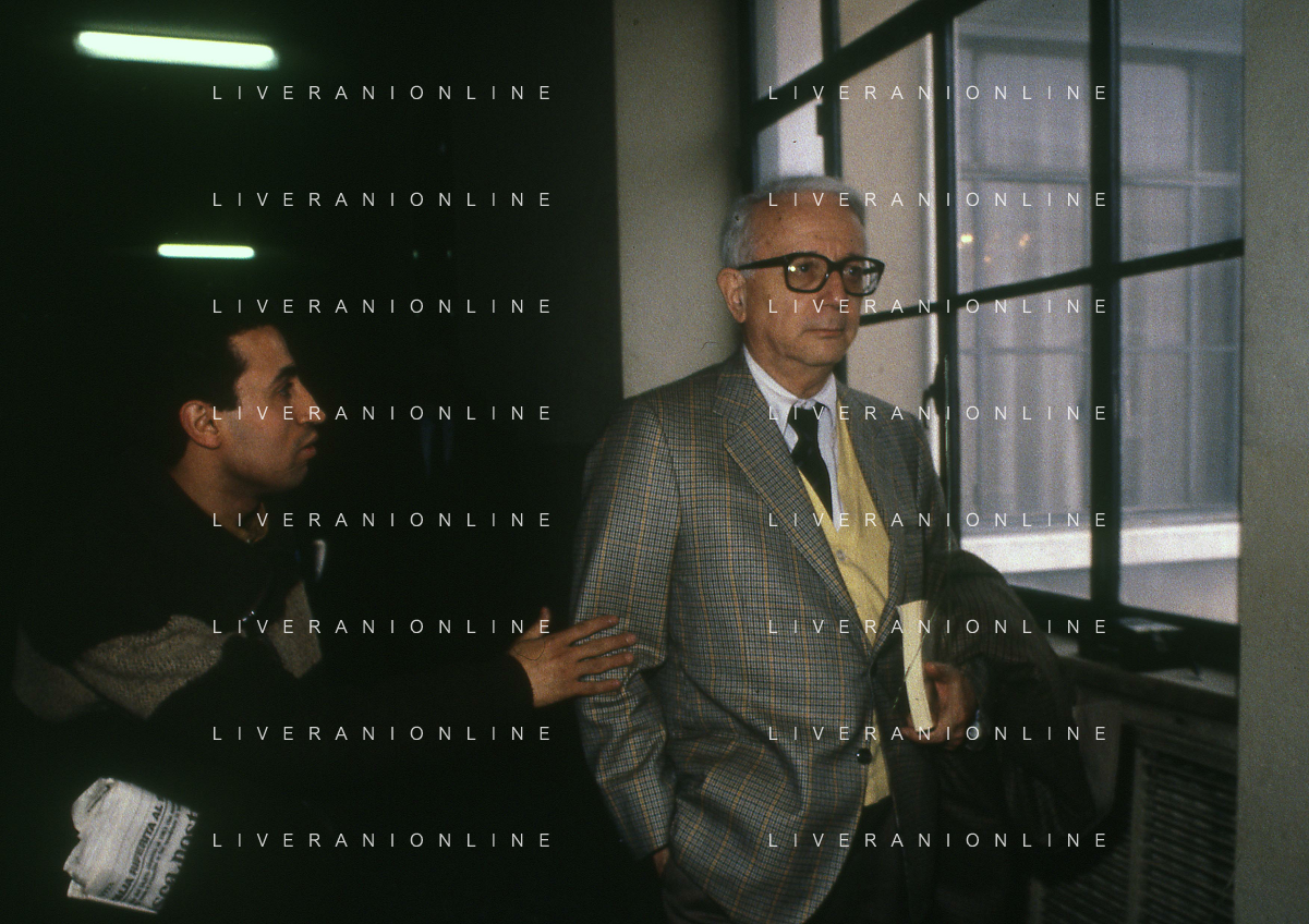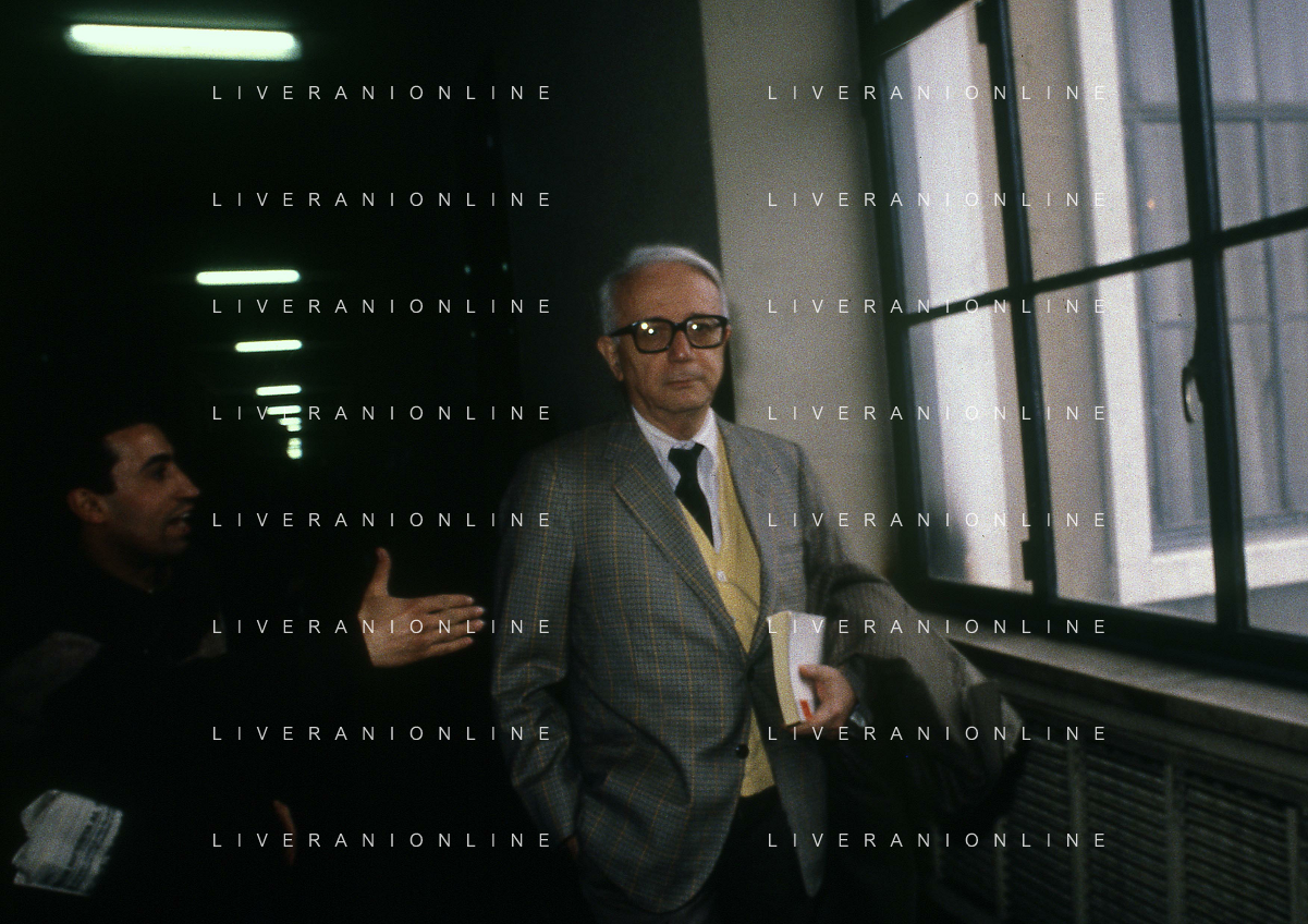 RETROSPETTIVA ENZO BIAGI GIORNALISTA E SCRITTORE E CONDUTTORE TELEVISIVO NELLA FOTO ENZO BIAGI A MILANO IN TRIBUNALE PER INFORMAZIONI SULLA BORSA DEL BANCHIERE ROBERTO CALVI NELL'ANNO 1986 AG ALDO LIVERANI SAS