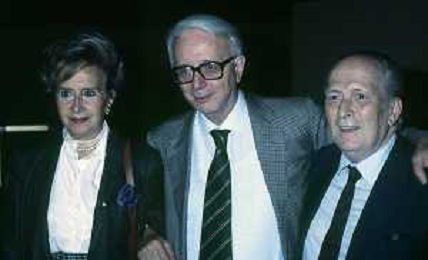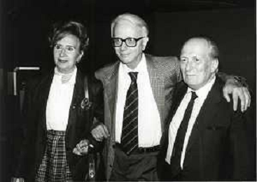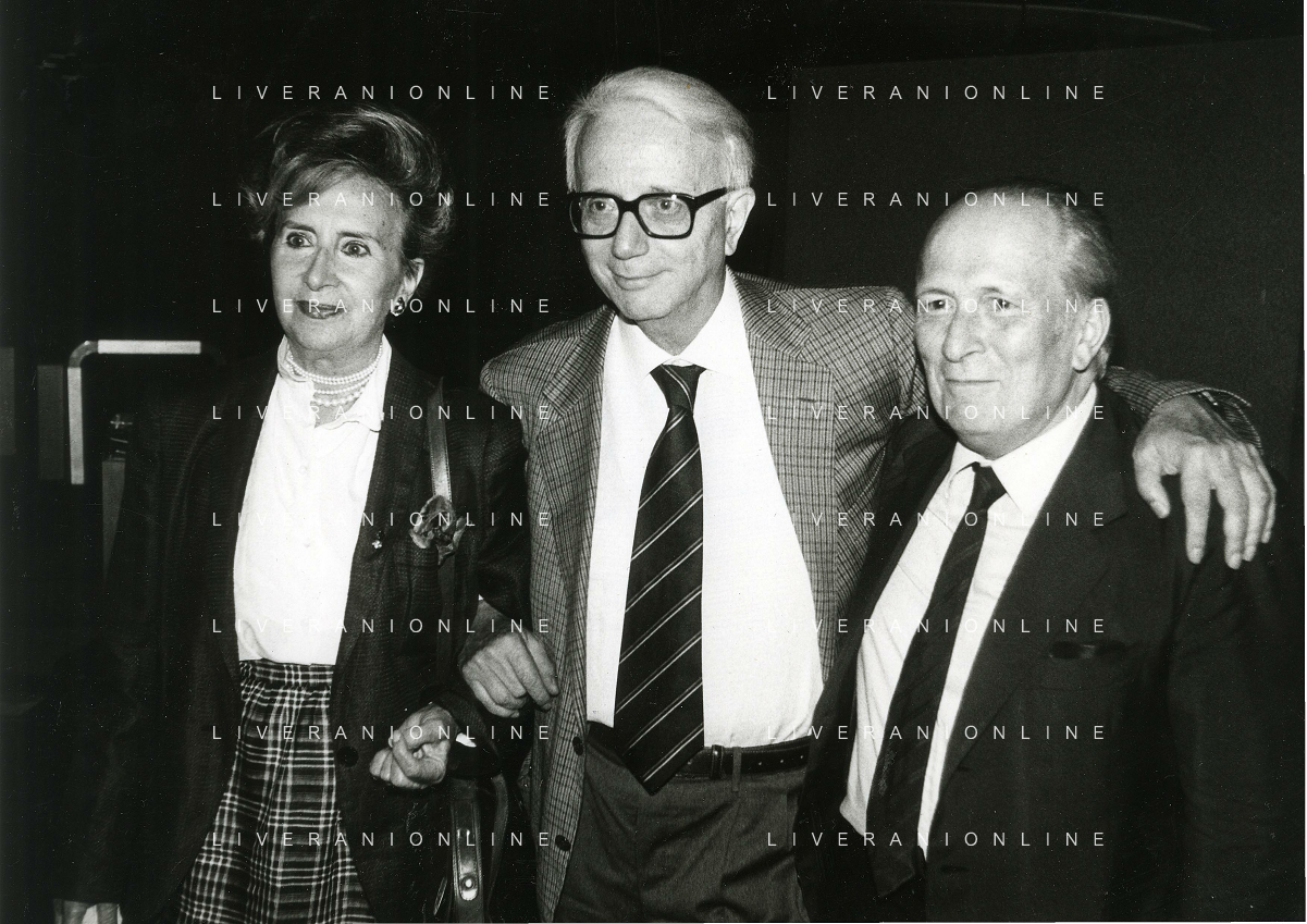 RETROSPETTIVA ENZO BIAGI GIORNALISTA E SCRITTORE E CONDUTTORE TELEVISIVO NELLA FOTO ENZO BIAGI A MILANO CON ORESTE DEL BUONO E CAMILLA CEDERNA NELL'ANNO 1987 AG ALDO LIVERANI SAS