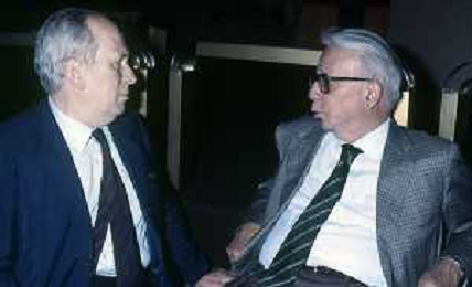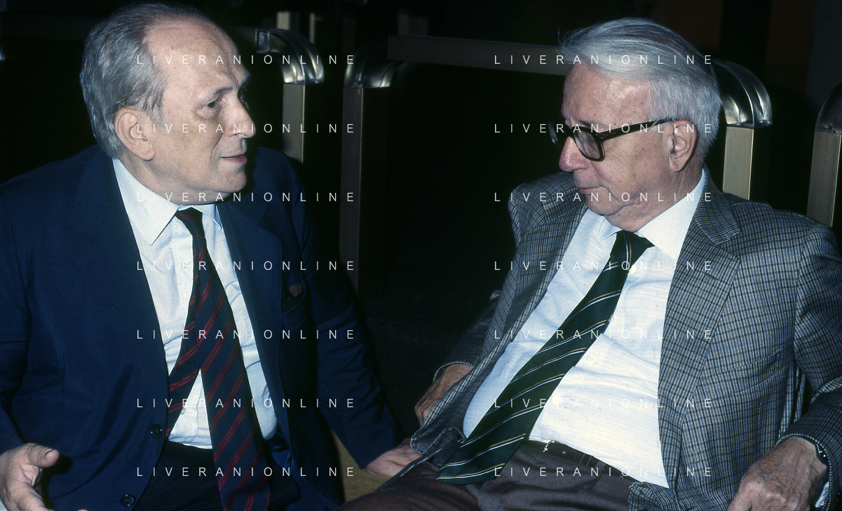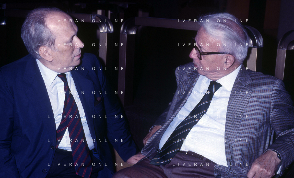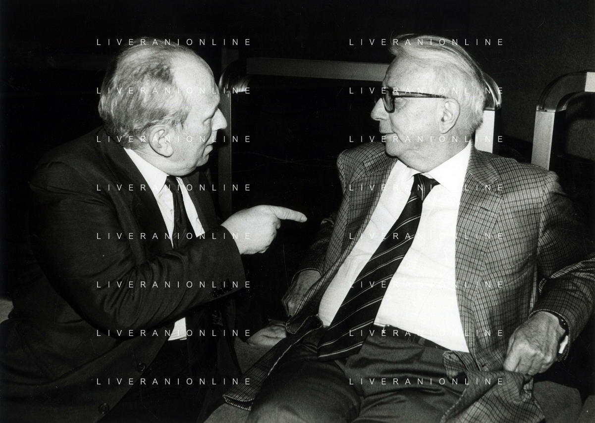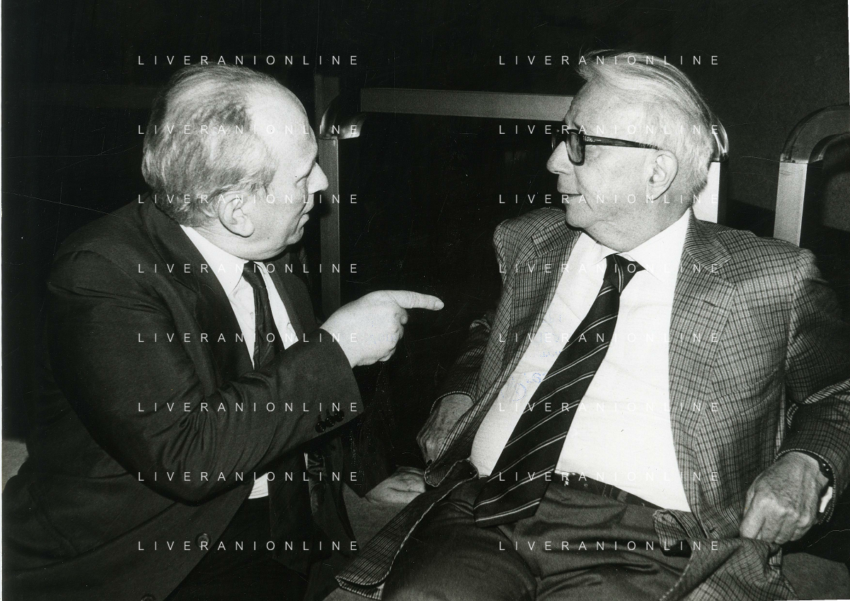RETROSPETTIVA ENZO BIAGI GIORNALISTA E SCRITTORE E CONDUTTORE TELEVISIVO NELLA FOTO ENZO BIAGI A MILANO CON ORESTE DEL BUONO NELL'ANNO 1987 A MILANO AG ALDO LIVERANI SAS