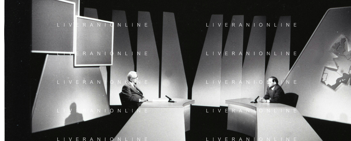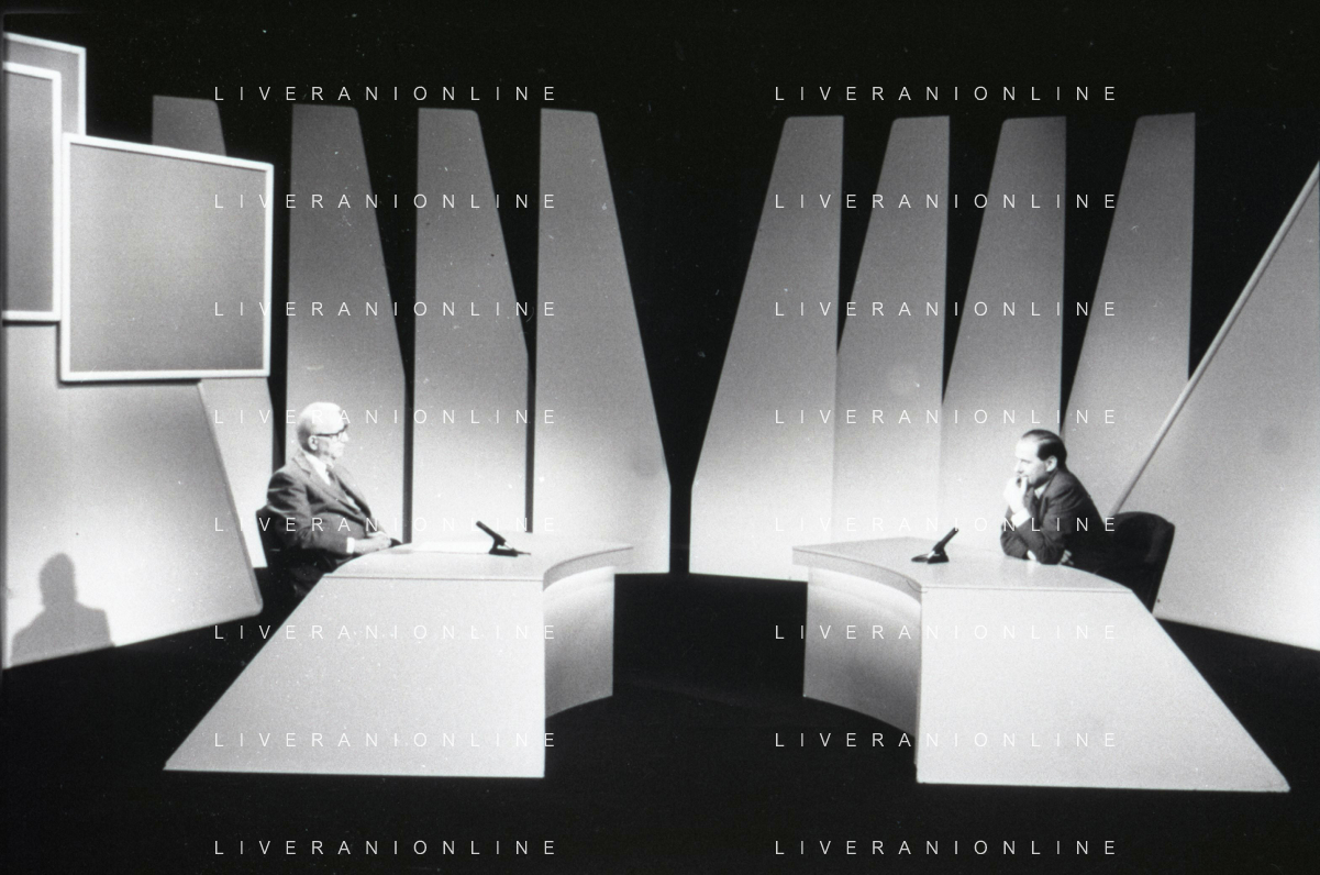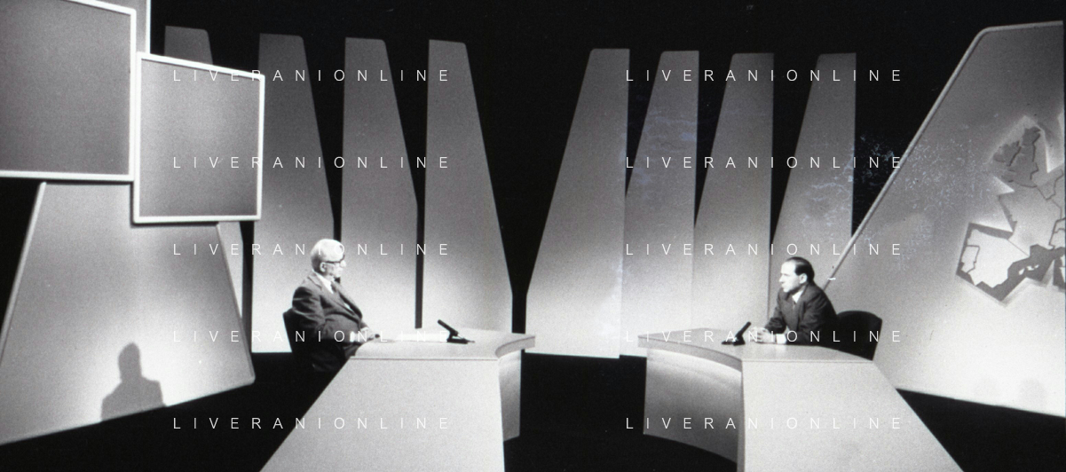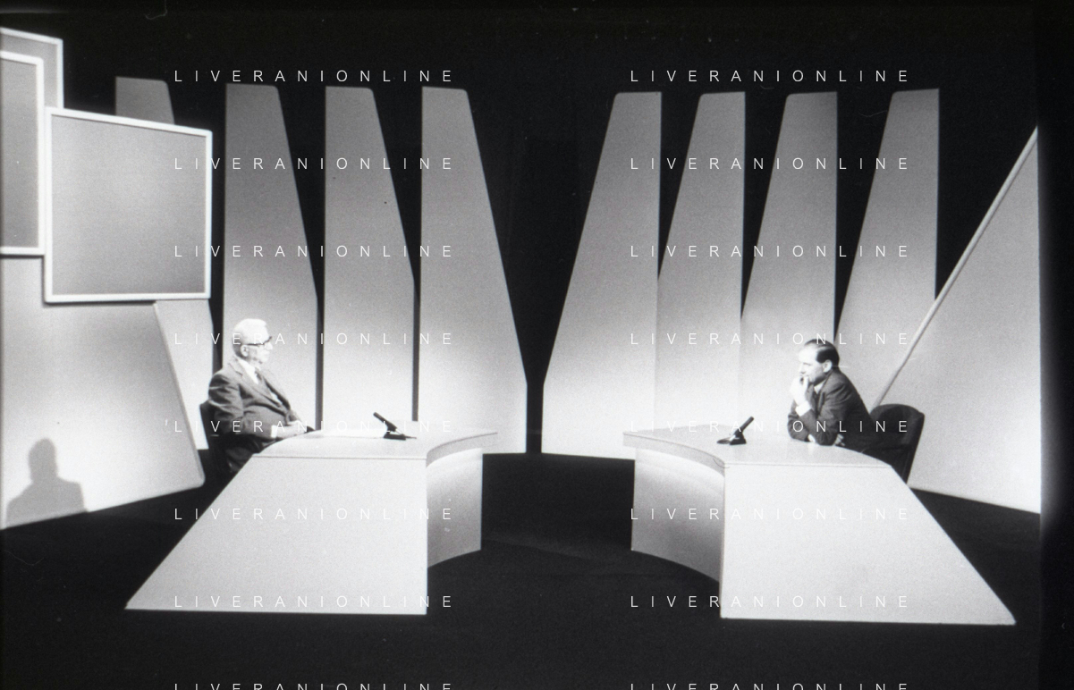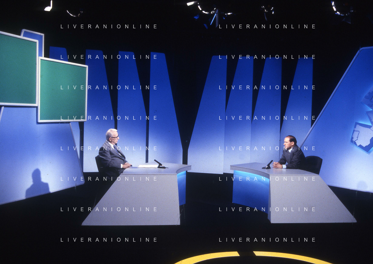 NEG-RETROSPETTIVA ENZO BIAGI GIONALISTA NELLA FOTO L'INTERVISTA DI ENZO BIAGI A SILVIO BERLUSCONI TRASMISSIONE SU RAI 2 RIPRODUZIONI IL GIORNO 04-02-1986 AG ALDO LIVERANI SAS