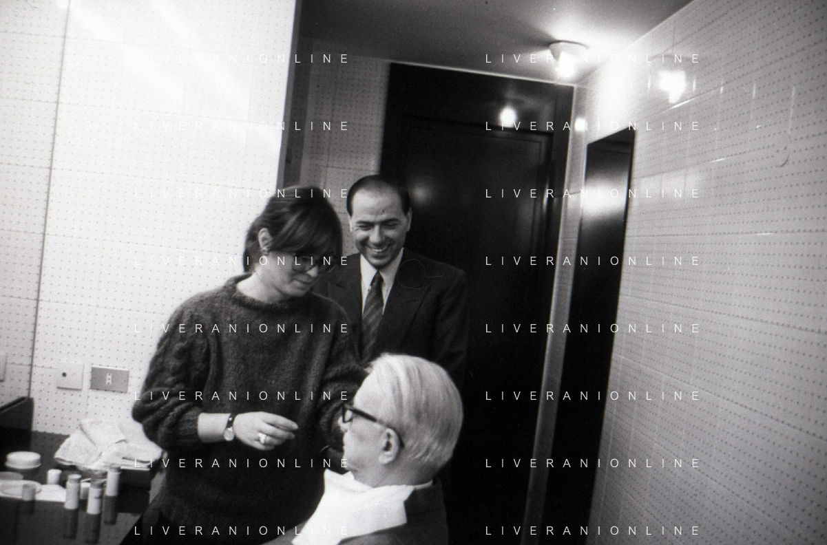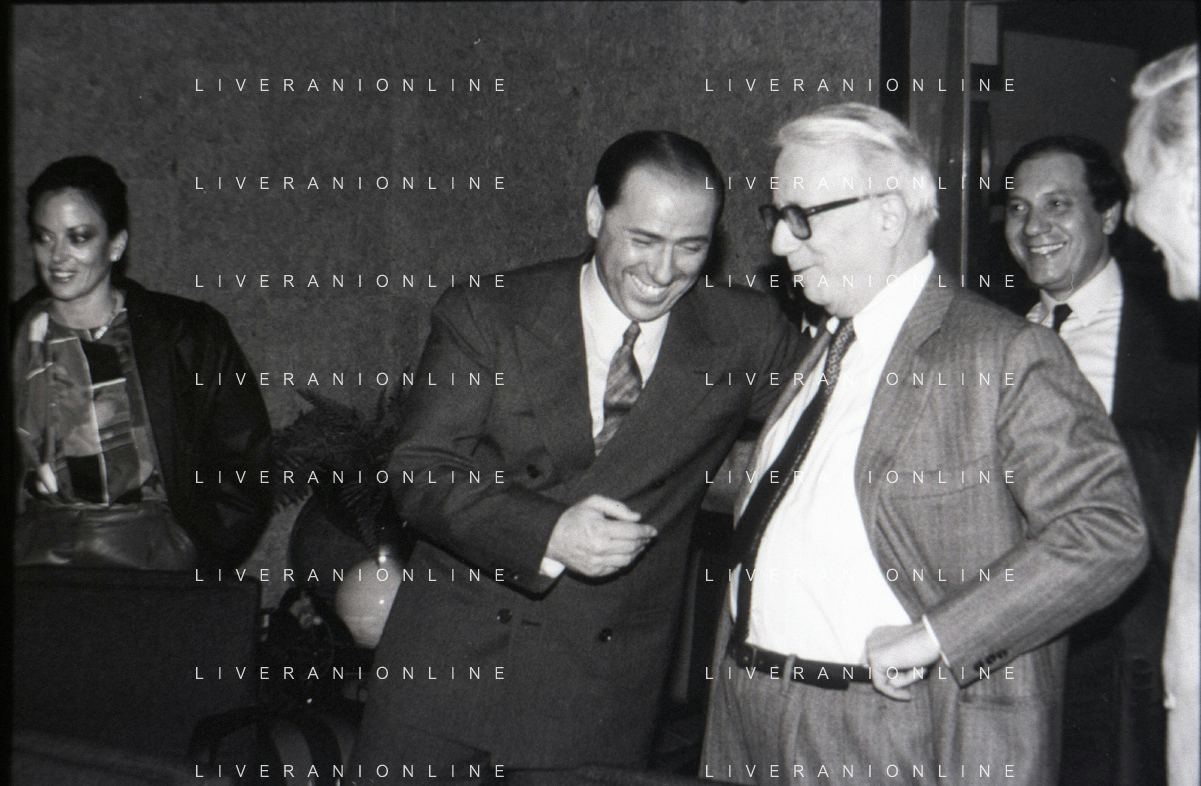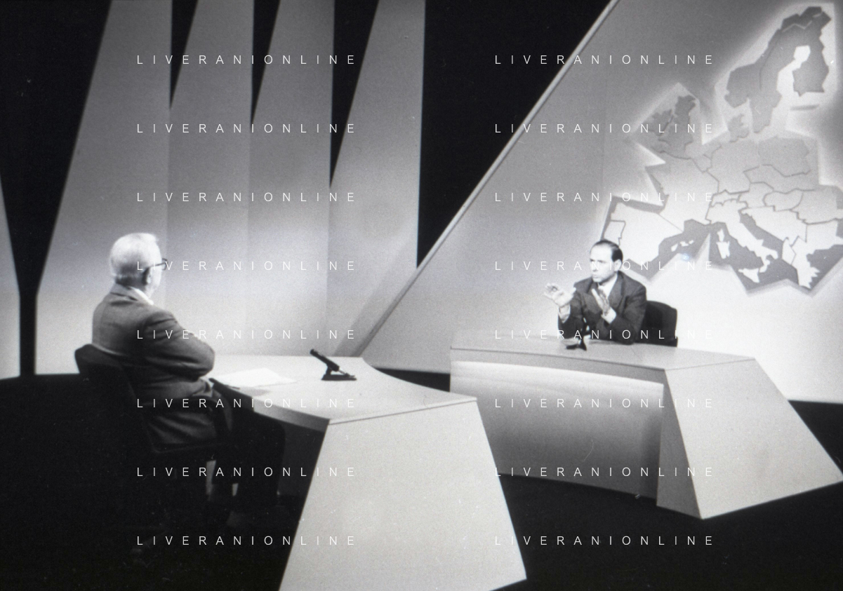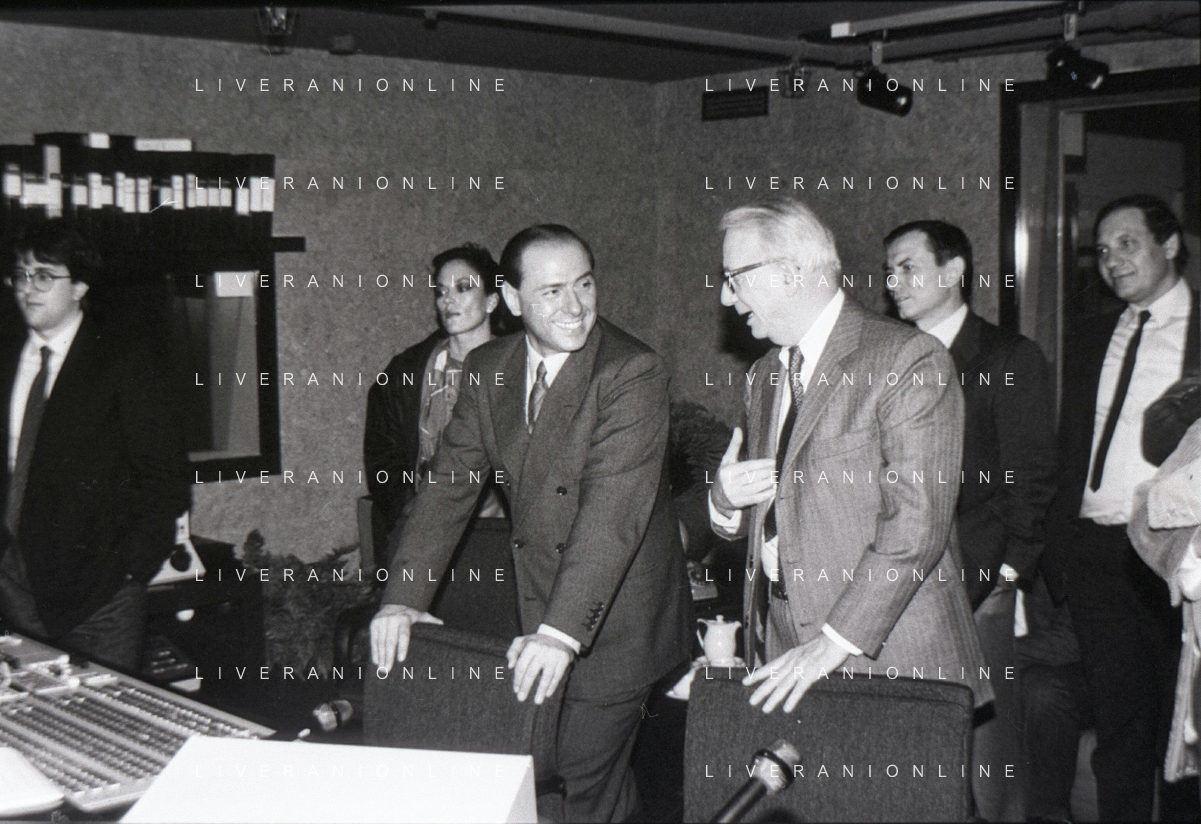 NEG-RETROSPETTIVA ENZO BIAGI GIONALISTA NELLA FOTO L'INTERVISTA DI ENZO BIAGI A SILVIO BERLUSCONI TRASMISSIONE SU RAI 2 RIPRODUZIONI IL GIORNO 04-02-1986 AG ALDO LIVERANI SAS