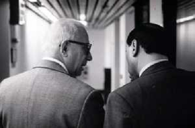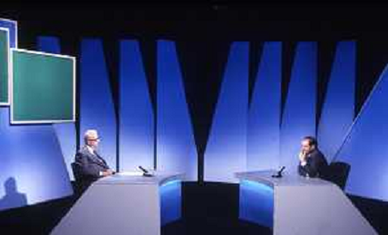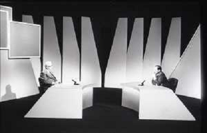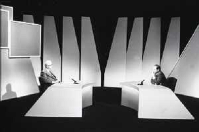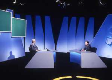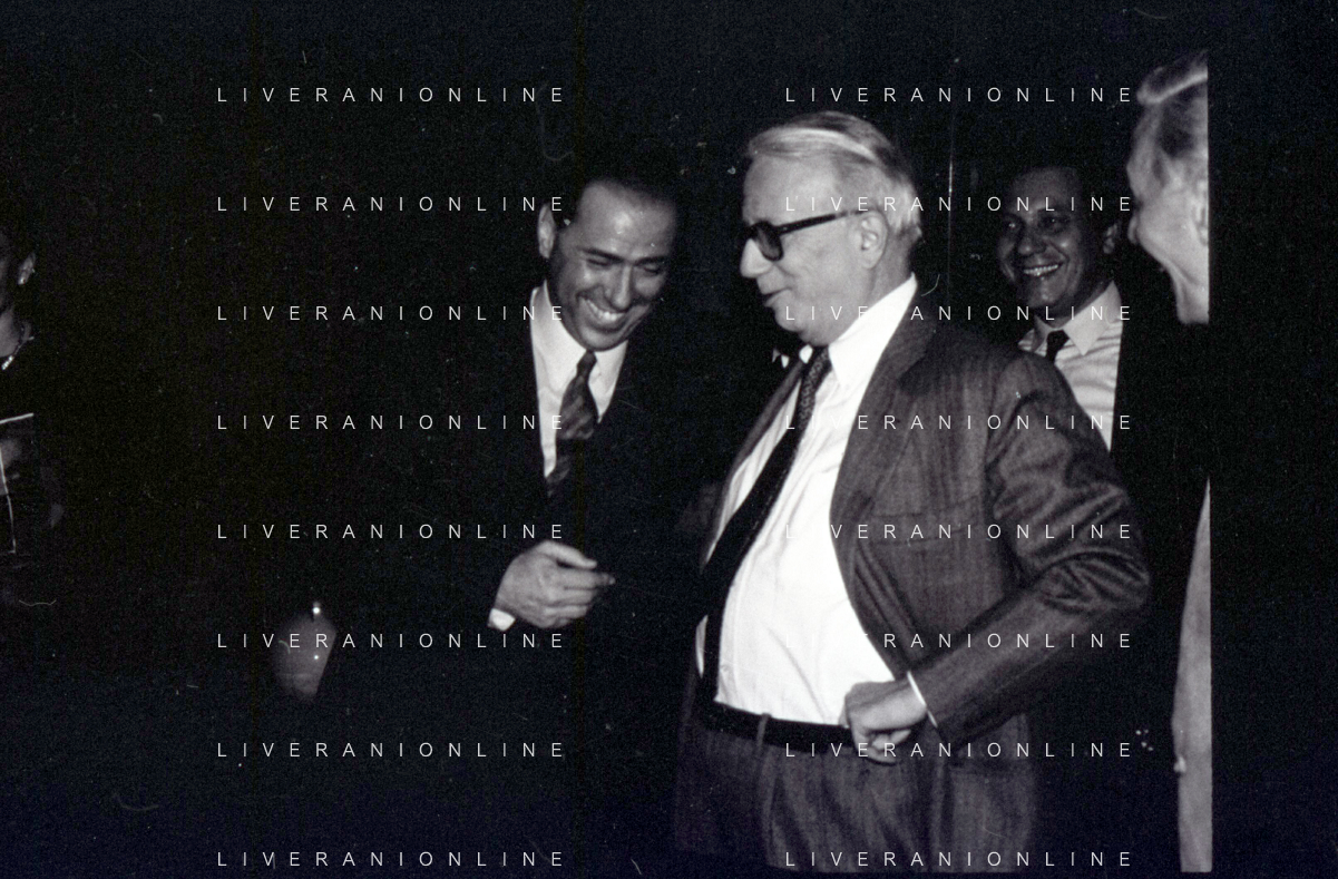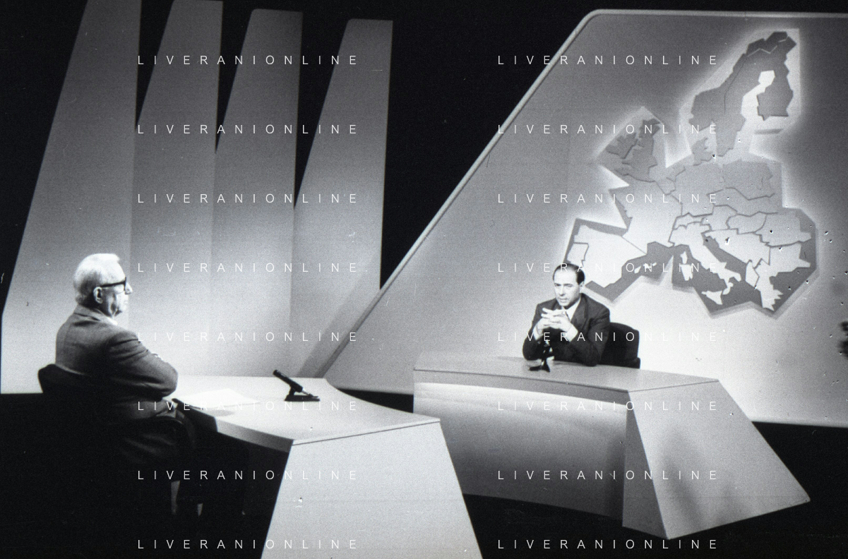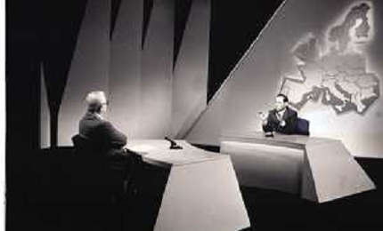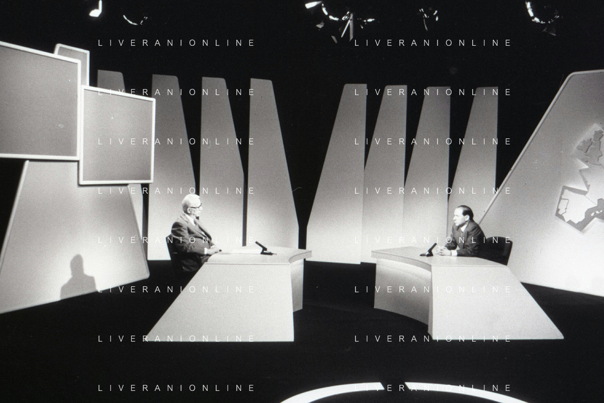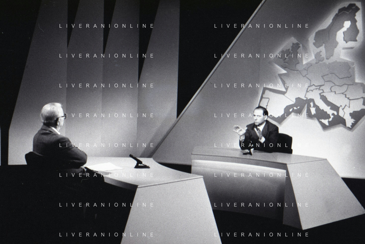 NEG-RETROSPETTIVA ENZO BIAGI GIONALISTA NELLA FOTO L'INTERVISTA DI ENZO BIAGI A SILVIO BERLUSCONI TRASMISSIONE SU RAI 2 RIPRODUZIONI IL GIORNO 04-02-1986 AG ALDO LIVERANI SAS