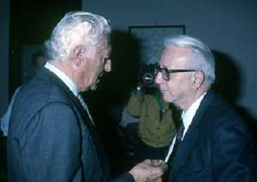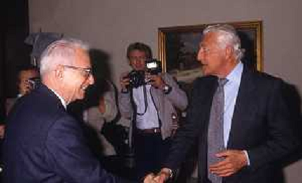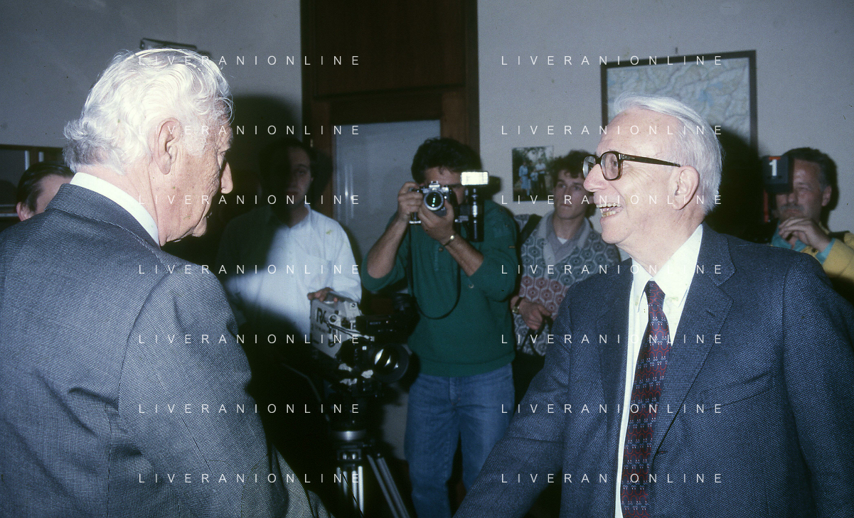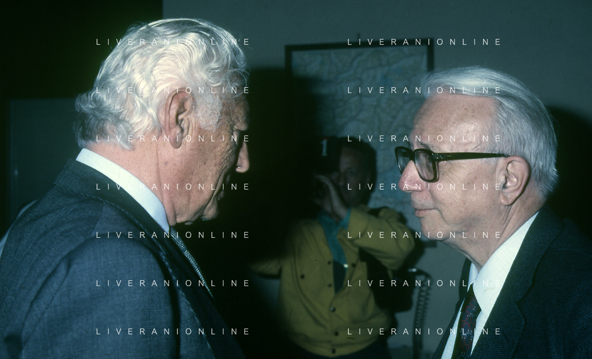 RETROSPETTIVA ENZO BIAGI GIORNALISTA E SCRITTORE E CONDUTTORE TELEVISIVO NELLA FOTO ENZO BIAGI A MILANO CON GIANNI AGNELLI NELL'ANNO 1987 AG ALDO LIVERANI SAS