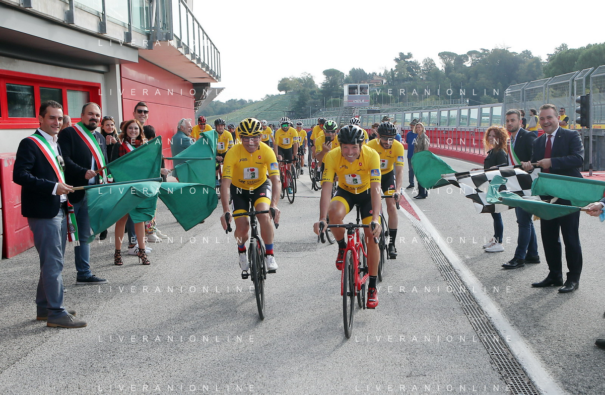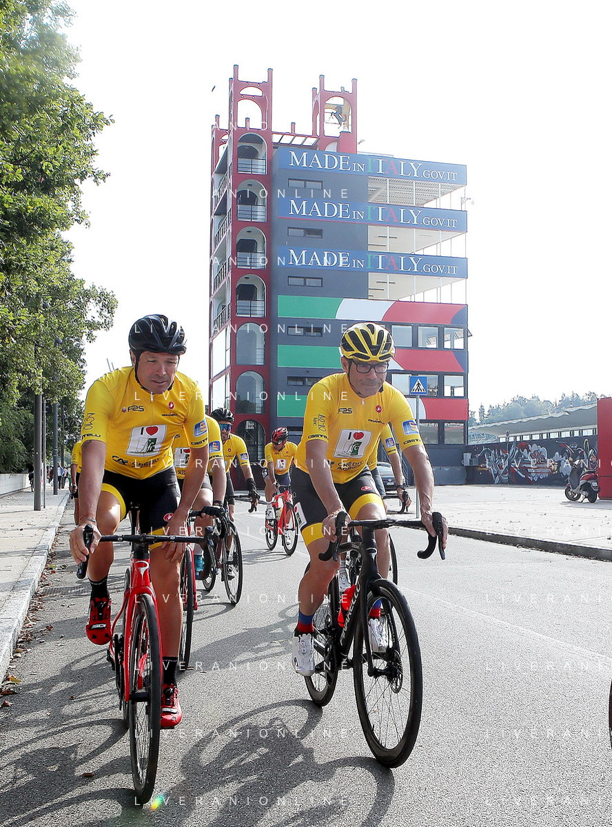 IMOLA 02 10 2021 AUTODROMO ENZO E DINO FERRARI BIKE TOUR FFC NELLA FOTO ASSESSORE REGIONALE RAFFAELE DONINI SINDACO MARCO PANIERI E ALTRI SINDACI DEL CIRCONDARIO CHE FANNO PARTIRE LA BICICLETATA.I PRESENTE ANCHE DAVIDE CASSANI FOTO GIANNI SANNA-AG ALDO LIVERANI SAS