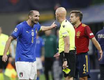 UEFA NATIONS LEAGUE 2021 gara semifinale ITALIA - SPAGNA del 06/10/2021 - nella foto: Giorgio Chiellini (Italy) protesta con l'arbitro ©Claudio Zamagni/Agenzia Aldo Liverani s.a.s. during European UEFA Nations League 2021 semifinal soccer match between Italy and Spain at san Siro Stadium in Milan on October 06 2021 photo credit by Claudio Zamagni/Aldo Liverani Photo Agency/AGENZIA ALDO LIVERANI SAS