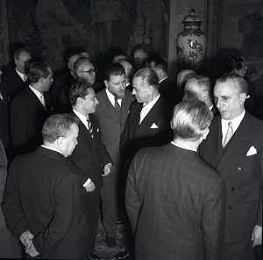 RETROSPETTIVA GIUSEPPE ROMITA POLITICO NELLA FOTO GIUSEPPE ROMITA NELL'ANNO 1955-1960 A ROMA CON ALDO BOZZI-GAETANO MARTINO-GIOVANNI GRONCHI-CAMPILLI SCAMBIO AUGURI NATALIZI NEL GOVERNO GRONCHI AG ALDO LIVERANI SAS