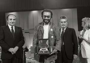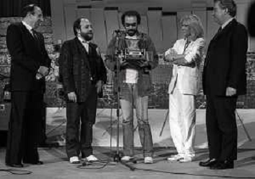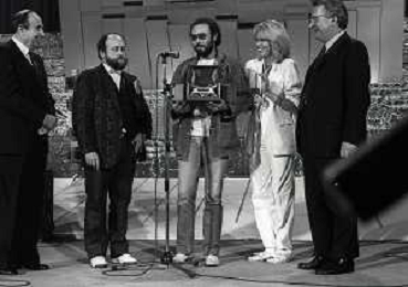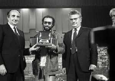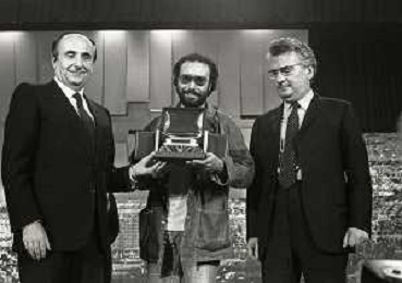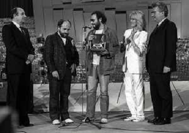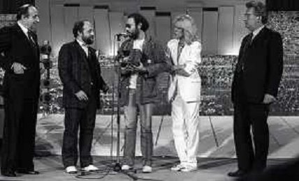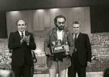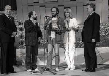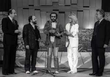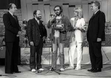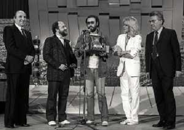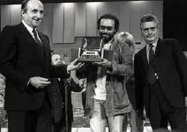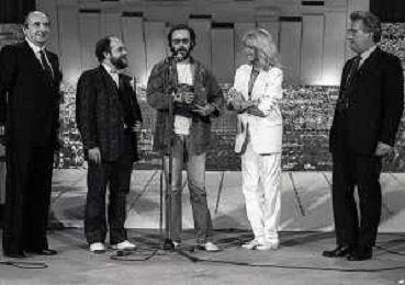 RETROSPETTIVA ANTONELLO VENDITTI CANTANTE NELLA FOTO ANTONELLO VENDITTI CON AMANDA LEAR E ENRICO BERUSCHI A VENEZIA NELL'ANNO 1980 PREMIATO CON LA GONDOLA D'ORO AG ALDO LIVERANI SAS