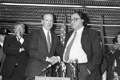 RETROSPETTIVA JAMES BAKER SEGRETARIO DI STATO AMERICANO NEL 1990 NELLA FOTO CON GIANNI DE MICHELIS ©VIGANTI/AGENZIA ALDO LIVERANI SAS