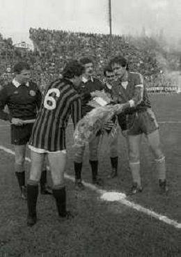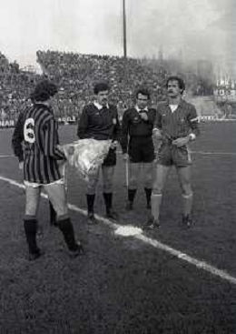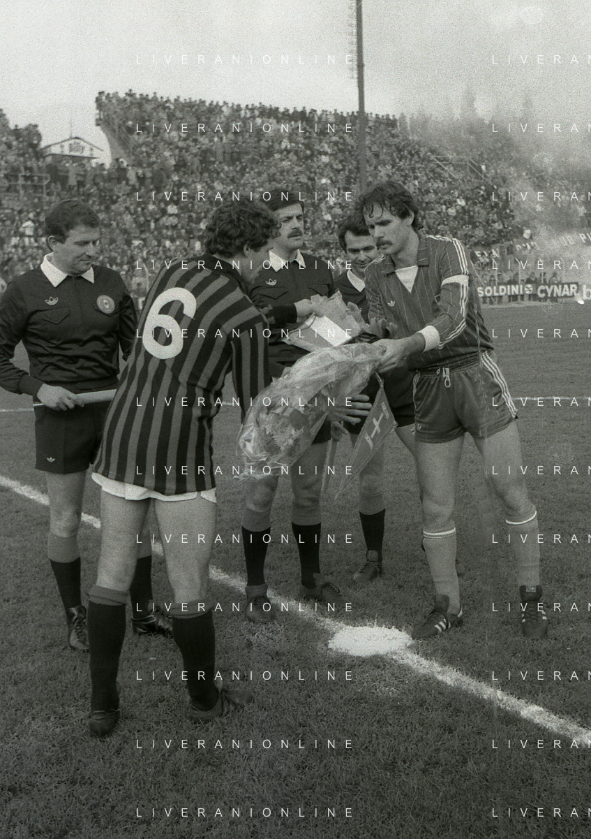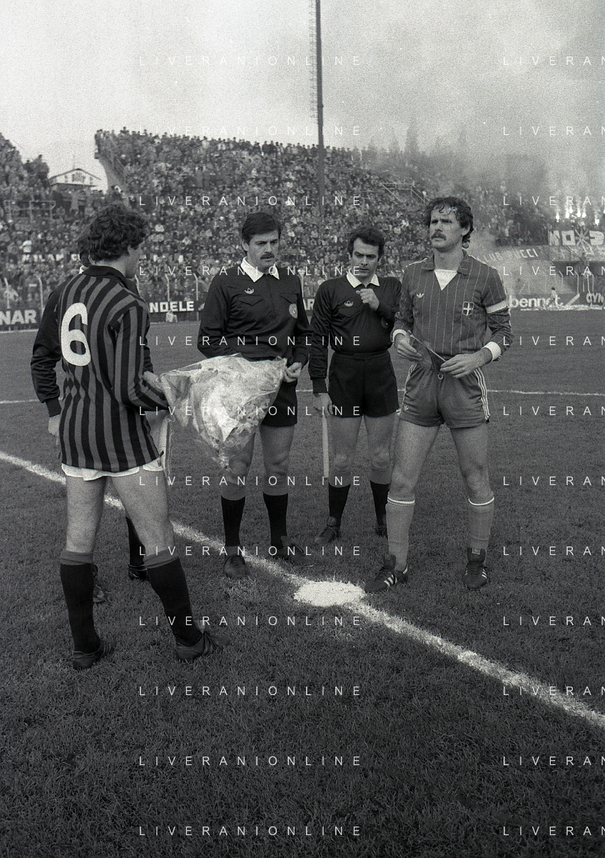 05-12-1982 COMO CAMPIONATO DI CALCIO SERIE B COMO-MILAN 1-0 NELLA FOTO FRANCO BARESOI E SILVANO FONTOLAN CON L'ARBITRO EGIDIO BALLERINI SCAMBIO GAGLIARDETTI AG ALDO LIVERANI SAS