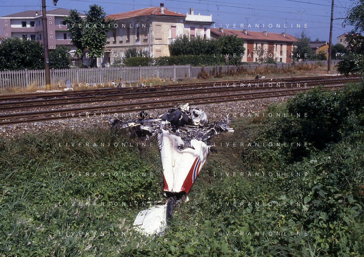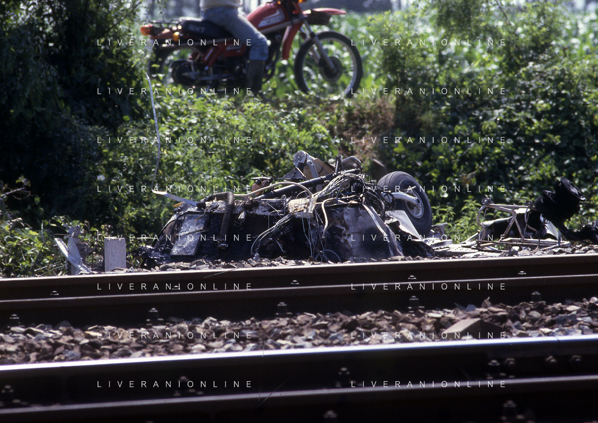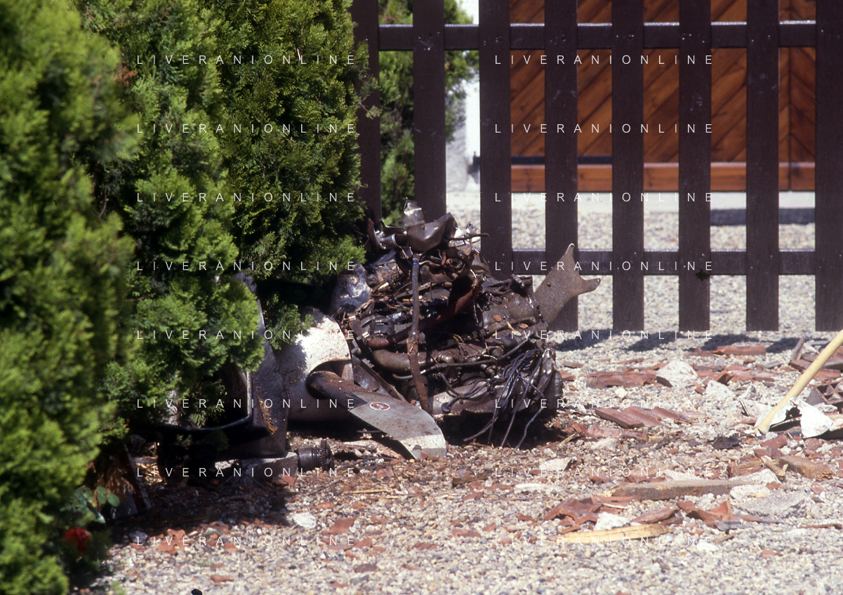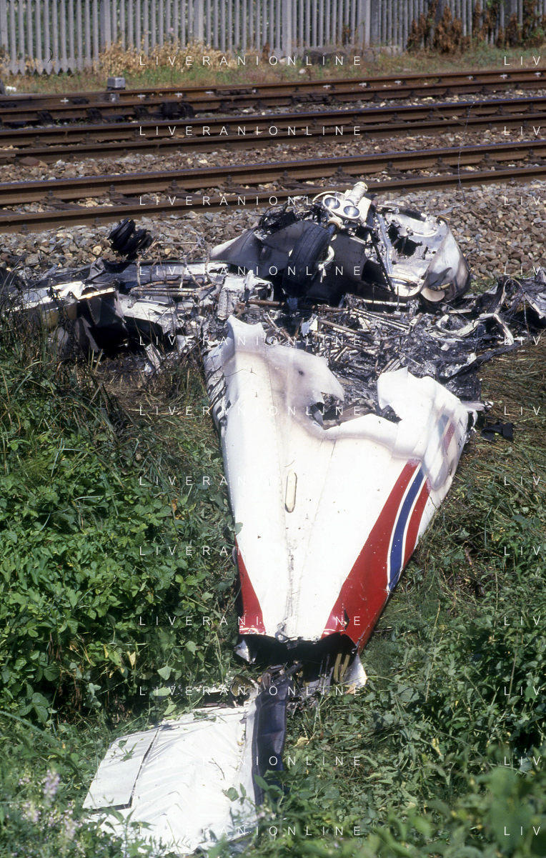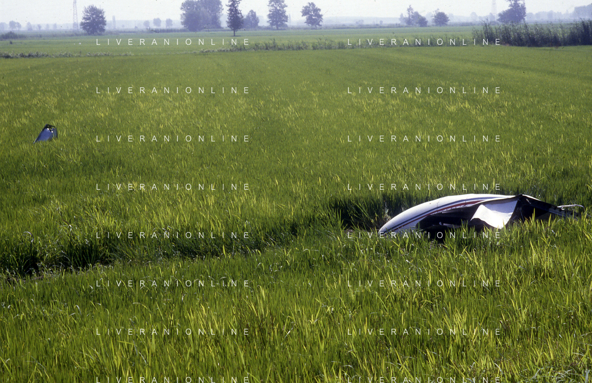 06-07-1986 SARTIRANA LOMELLINA INCIDENTE AEREO GIORGIO AIAZZONE NELLA FOTO I RESTI DELL'AEREO SU CUI VIAGGIAVA GIORGIO AIAZZONE PRECIPITATO A SARTIRANA LOMELLINA AG ALDO LIVERANI SAS
