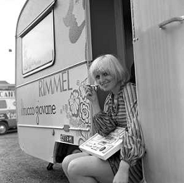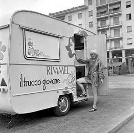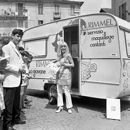 1969 OTTAVA EDIZIONE DEL CANTAGIRO MANIFESTAZIONE CANORA ITINERANTE - RETROSPETTIVA NELLA FOTO LA CANTANTE DORI GHEZZI DAVANTI AL CARAVAN DELLA RIMMEL MAQUILLAGE SPONSOR DELLA MANIFESTAZIONE ©Archivio Giovanni Liverani /AGENZIA ALDO LIVERANI SAS