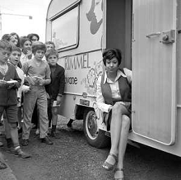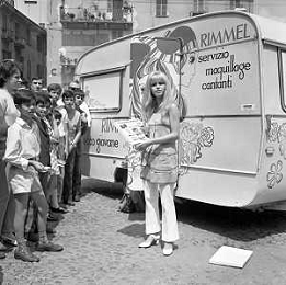 1969 OTTAVA EDIZIONE DEL CANTAGIRO MANIFESTAZIONE CANORA ITINERANTE - RETROSPETTIVA NELLA FOTO LA CANTANTE GABRIELLA FERRI DAVANTI AL CARAVAN DELLA RIMMEL MAQUILLAGE SPONSOR DELLA MANIFESTAZIONE ©Archivio Giovanni Liverani /AGENZIA ALDO LIVERANI SAS