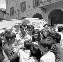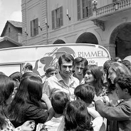 1969 OTTAVA EDIZIONE DEL CANTAGIRO MANIFESTAZIONE CANORA ITINERANTE - RETROSPETTIVA NELLA FOTO IL CANTANTE PAOLO MENGOLI DAVANTI AL CARAVAN DELLA RIMMEL MAQUILLAGE SPONSOR DELLA MANIFESTAZIONE ©Archivio Giovanni Liverani /AGENZIA ALDO LIVERANI SAS
