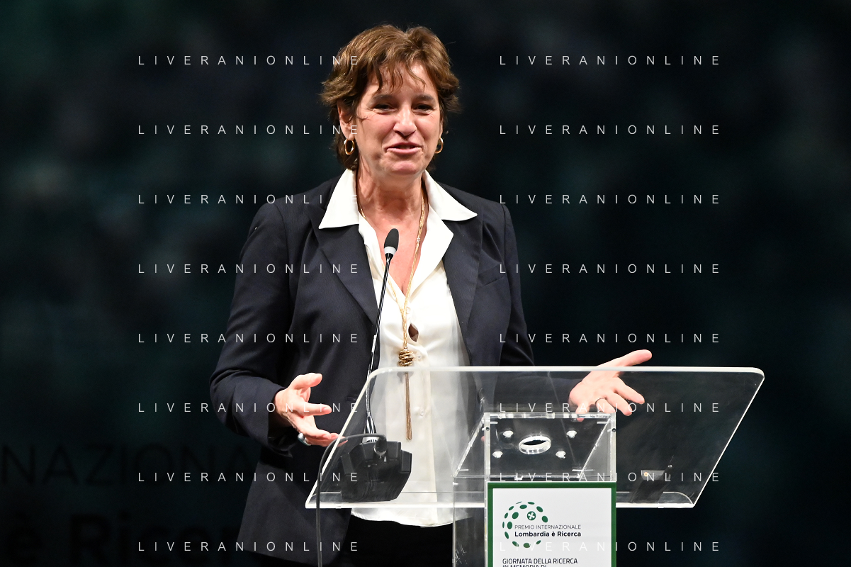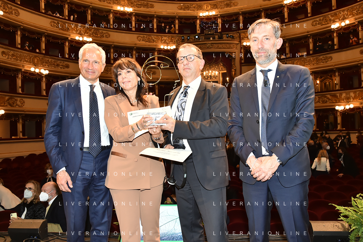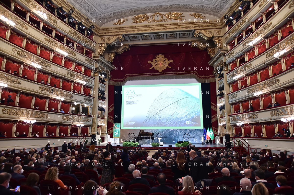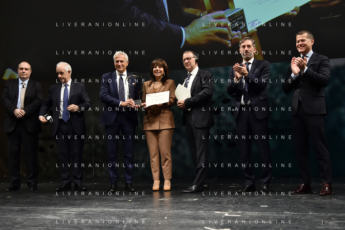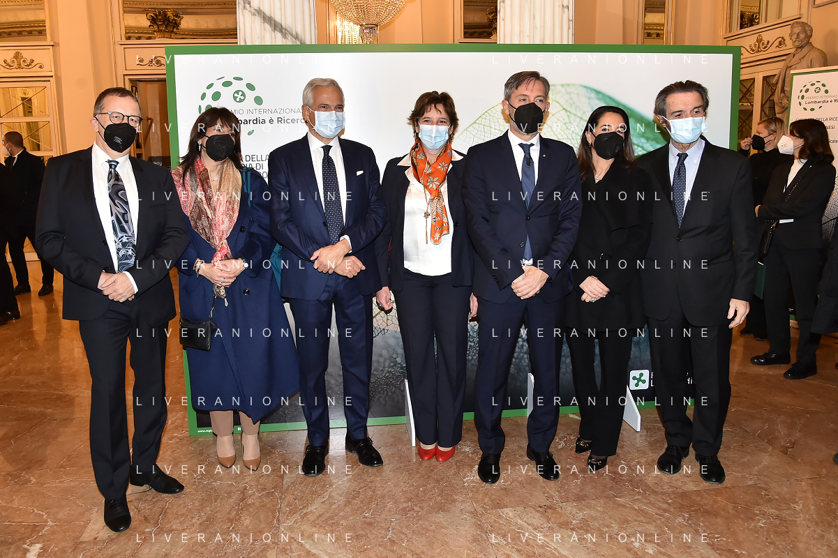 © TVRG Giornata della Ricerca nella foto da SX i premiati Markus Antonietti, Marcella Bonchio con Paolo Veronesi presidente di Fondazione Veronesi, il ministro Maria Cristina Messa, Fabrizio Sala assessore regionale, Licia Ronzulli e Attilio Fontana presidente di Regione Lombardia Milano 08-11-2021 Consegna del premio Lombardia e' Ricerca nel corso dell'evento Giornata della Ricerca organizzato da Regione Lombardia al Teatro alla Scala di Milano foto Roberto Garavaglia/ag. Aldo Liverani sas/ AG ALDO LIVERANI SAS
