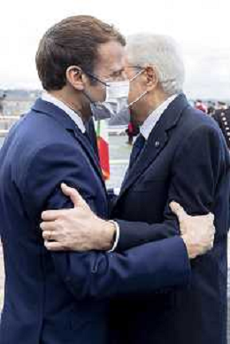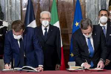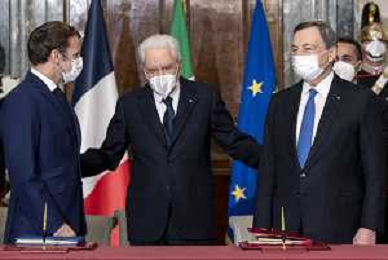 oma - Il Presidente della Repubblica Sergio Mattarella con il Presidente della Repubblica Francese, Emmanuel Macron e il Presidente del Consiglio Mario Draghi, al termine dell'incontro per la firma del “Trattato per una cooperazione bilaterale rafforzata” oggi 26 novembre 2021. (Foto di Paolo Giandotti - Ufficio per la Stampa e la Comunicazione della Presidenza della Repubblica)