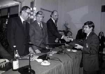 16-12-1997 MILANO FESTA DI NATALE LEGA CALCIO NELLA FOTO FRANCO CARRARO E LUCIANO NIZZOLA PREMIANO FABRIZIO GARILLI AG ALDO LIVERANI SAS