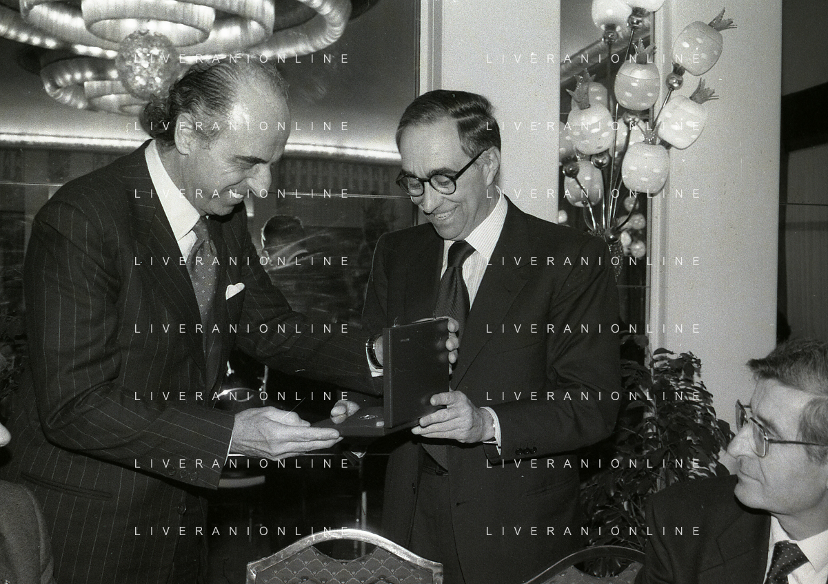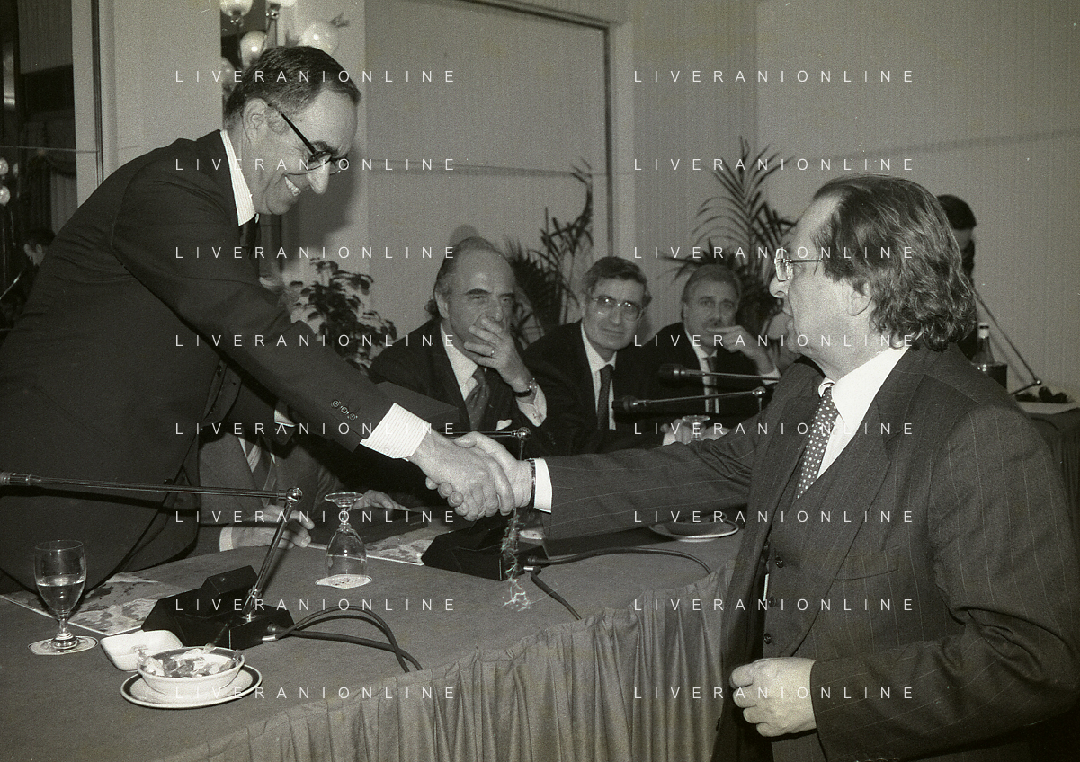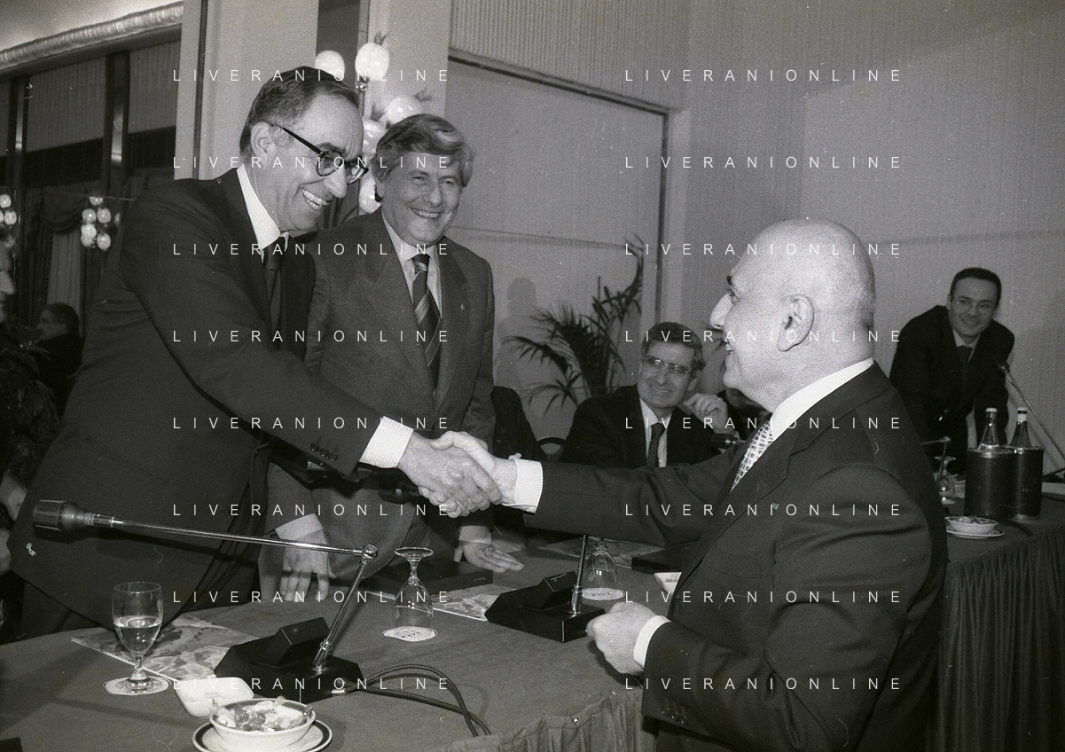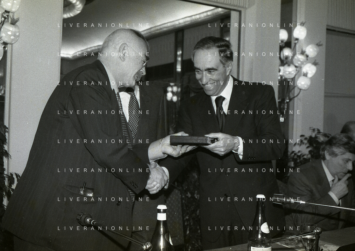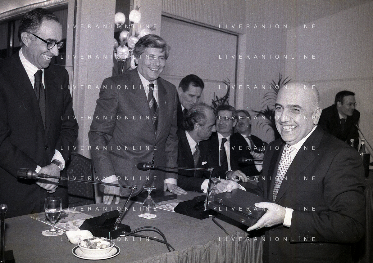 16-12-1997 MILANO FESTA DI NATALE LEGA CALCIO NELLA FOTO FRANCO CARRARO E LUCIANO NIZZOLA PREMIANO ADRIANO GALLIANI AG ALDO LIVERANI SAS
