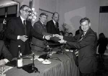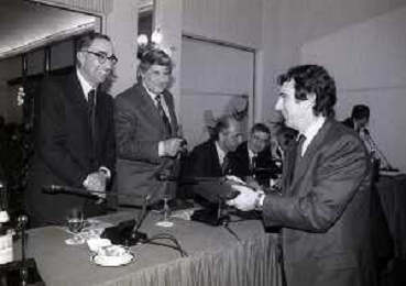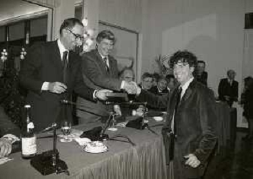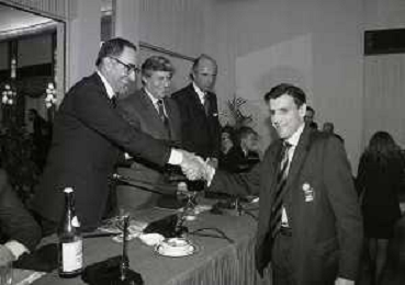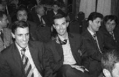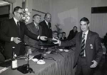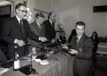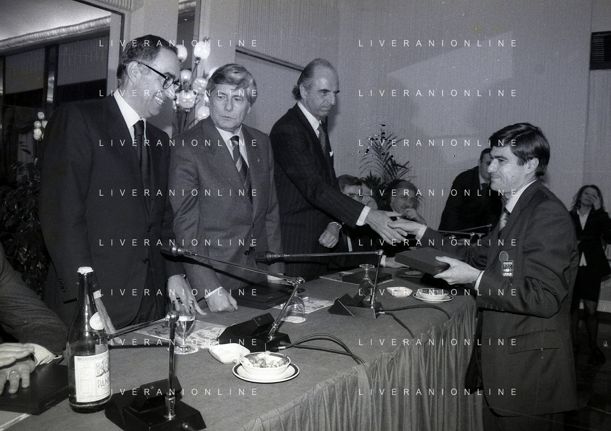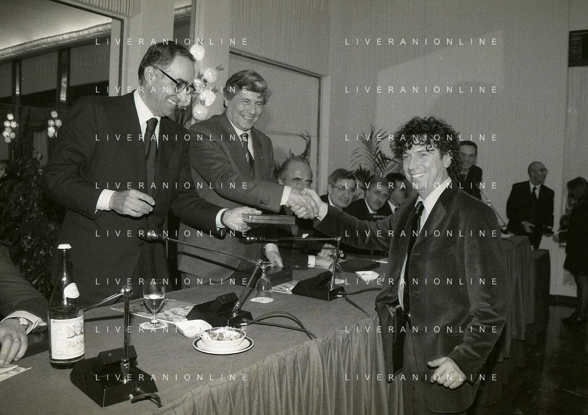 16-12-1997 MILANO FESTA DI NATALE LEGA CALCIO NELLA FOTO FRANCO CARRAROCON LUCIANO NIZZOLA E MARIO PESCANTE PREMIANO PIRLUIGI PAIRETTO AG ALDO LIVERANI SAS