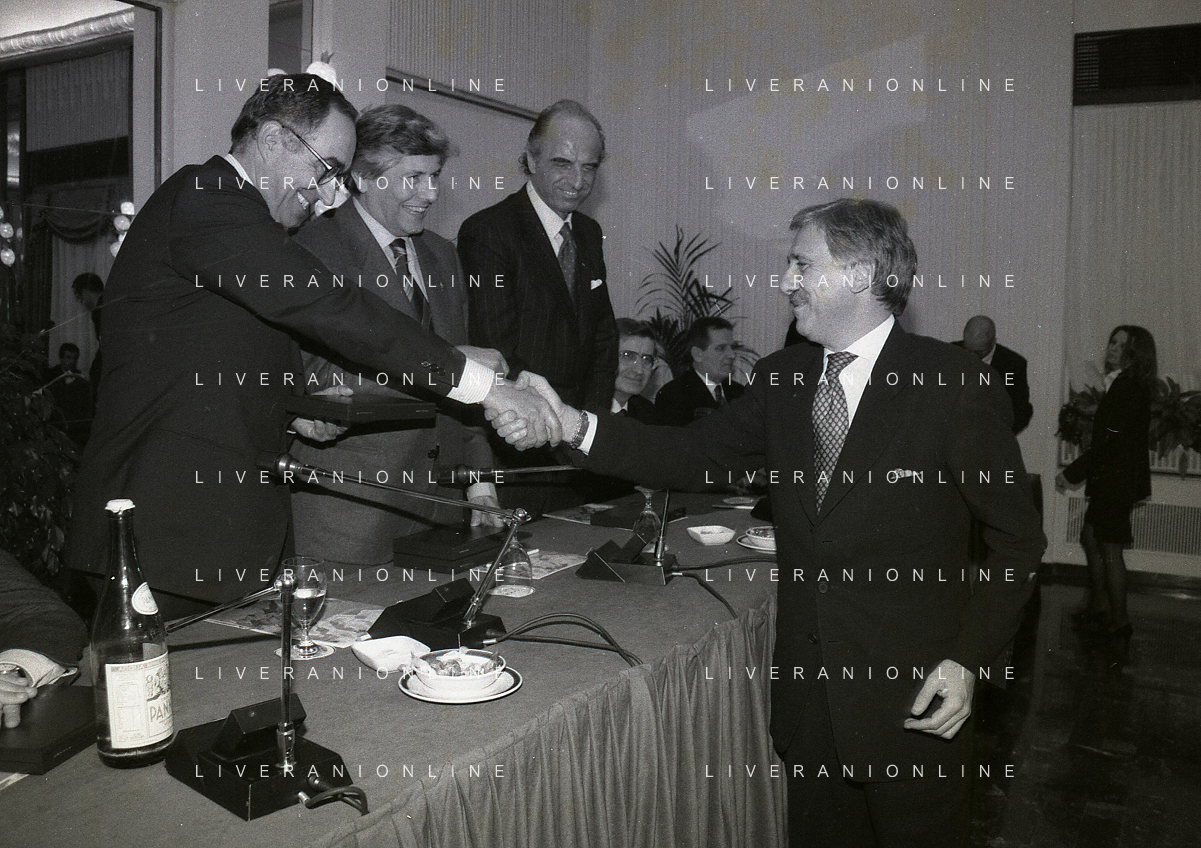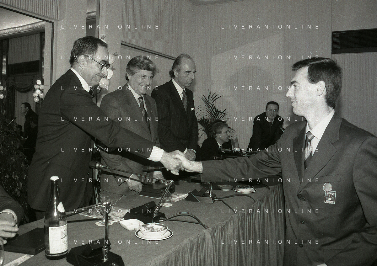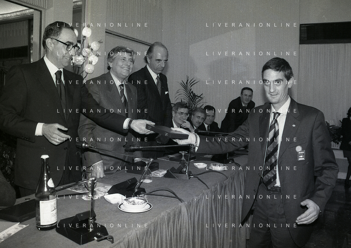 16-12-1997 MILANO FESTA DI NATALE LEGA CALCIO NELLA FOTO FRANCO CARRARO E LUCIANO NIZZOLA PREMIANO SERGIO GASPARIN AG ALDO LIVERANI SAS
