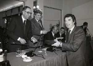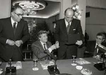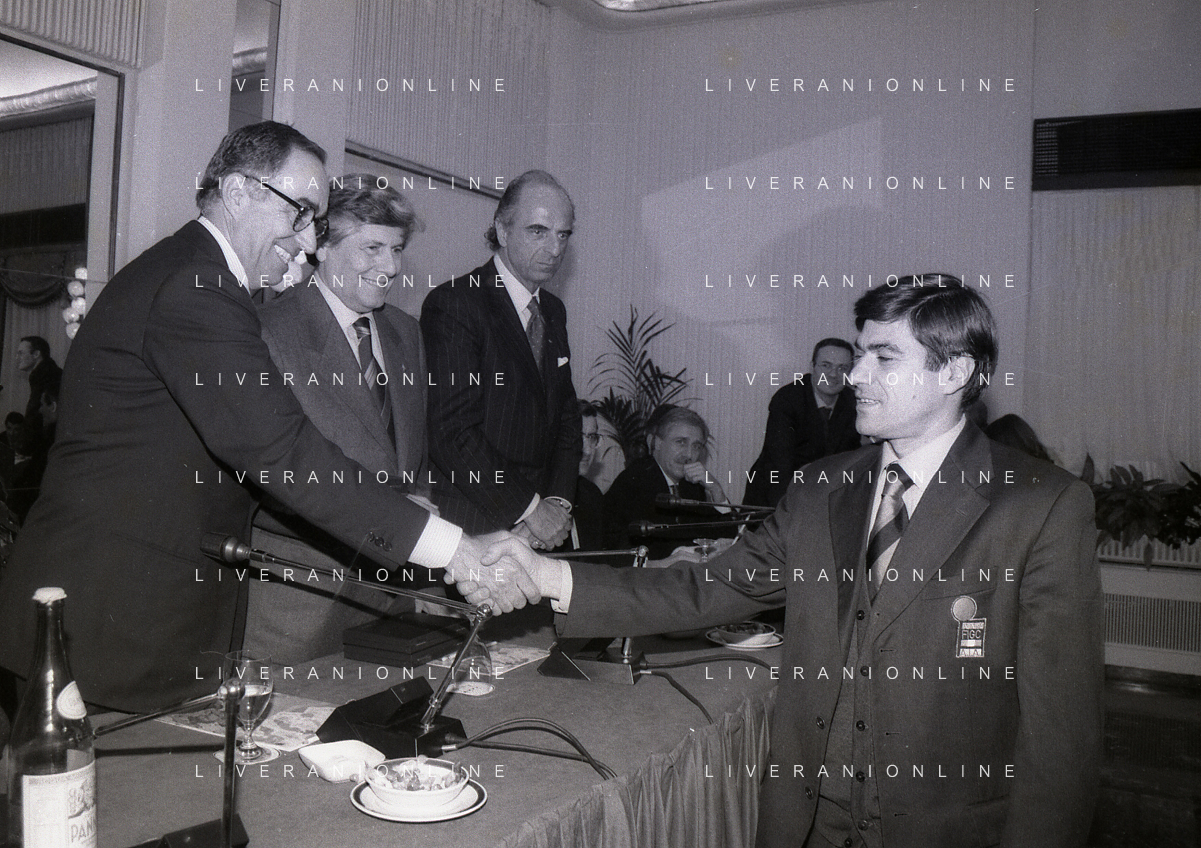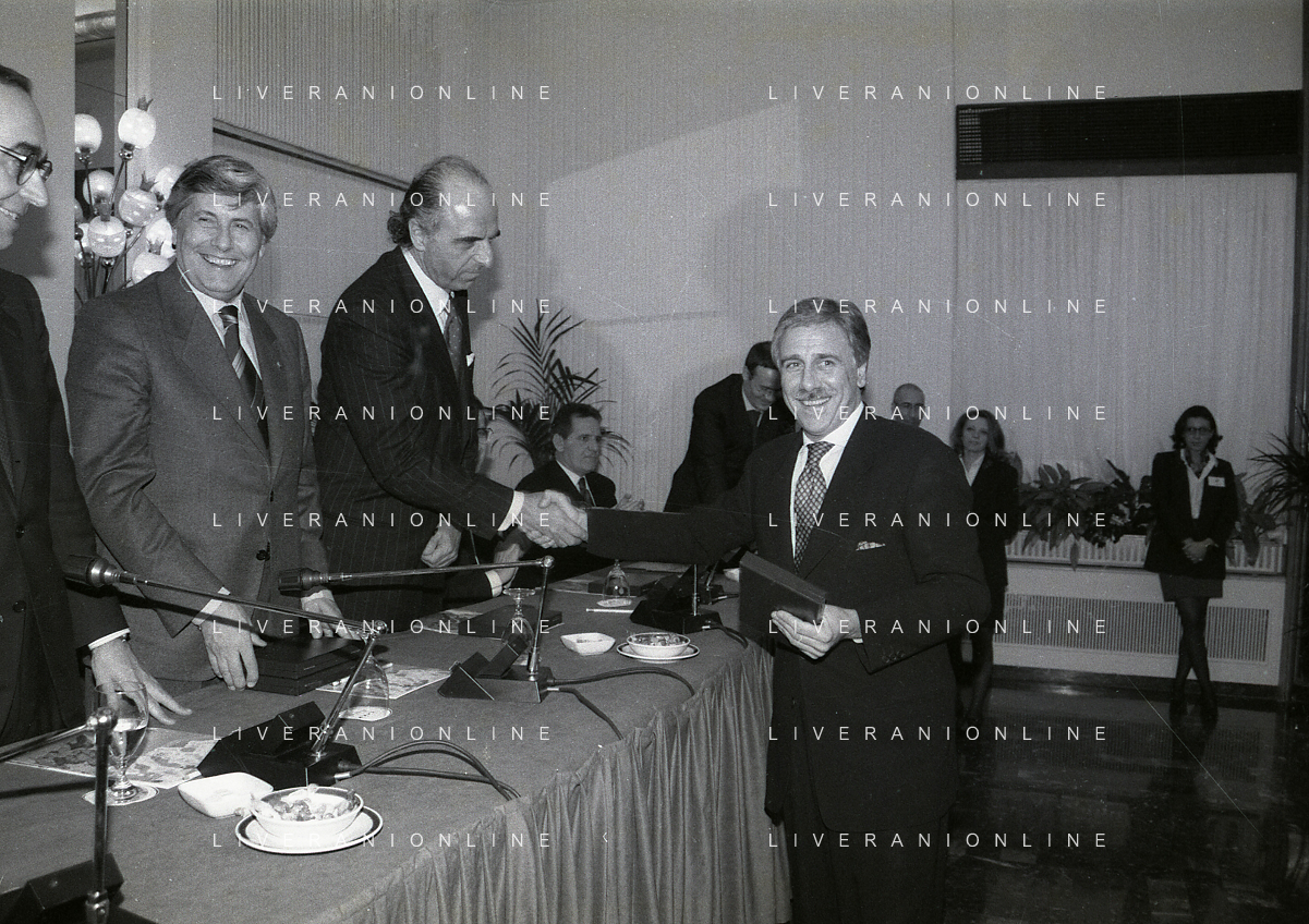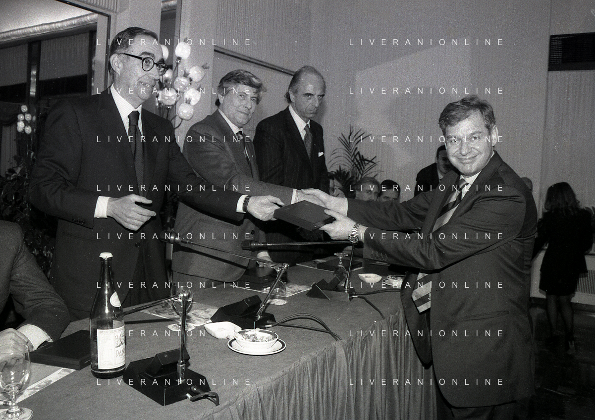 16-12-1997 MILANO FESTA DI NATALE LEGA CALCIO NELLA FOTO FRANCO CARRARO E LUCIANO NIZZOLA PREMIANO SERGIO GASPARIN AG ALDO LIVERANI SAS