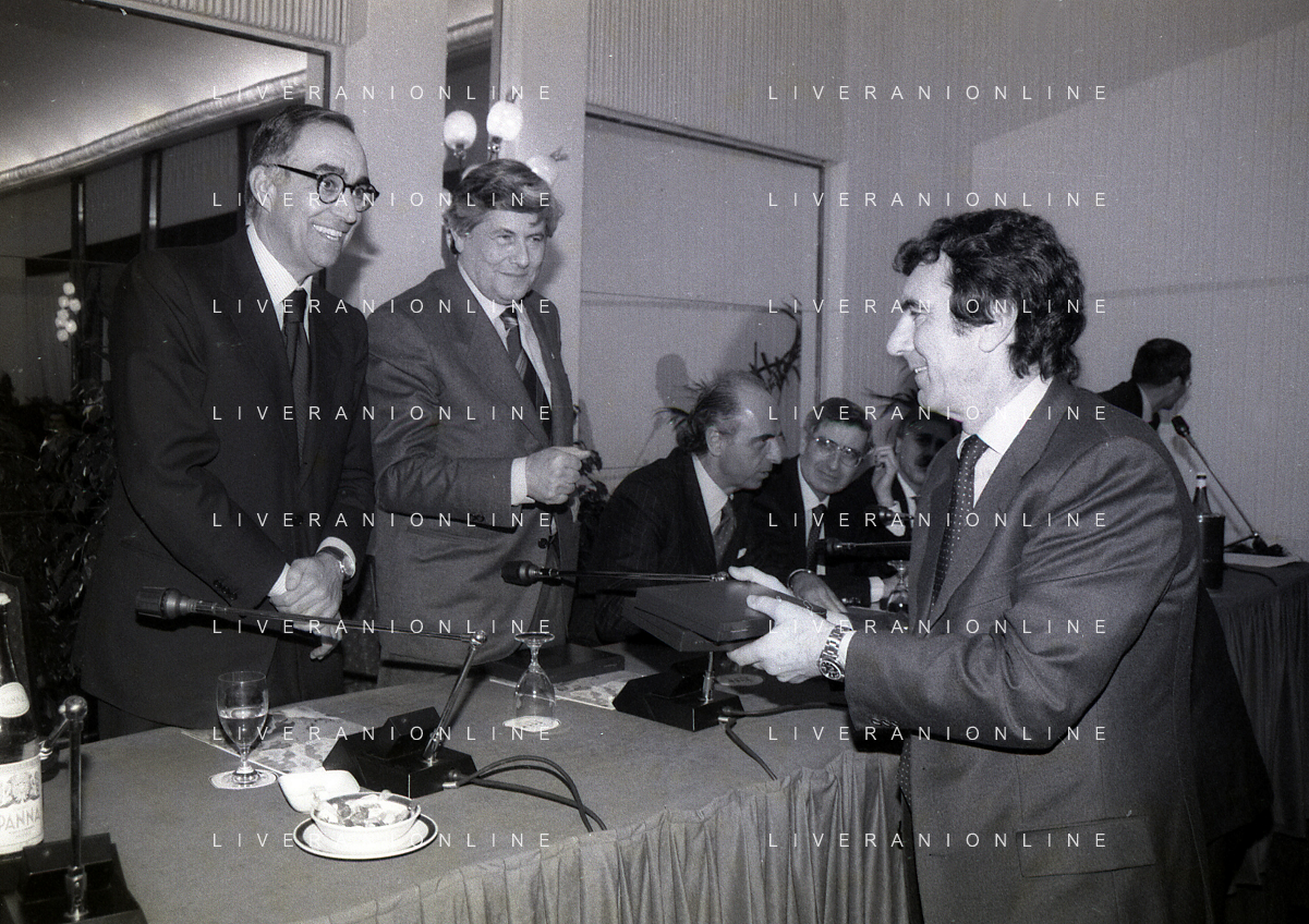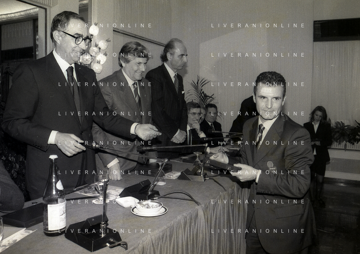16-12-1997 MILANO FESTA DI NATALE LEGA CALCIO NELLA FOTO FRANCO CARRARO E LUCIANO NIZZOLA PREMIANO L'ARBITRO DOMENICO MESSINA AG ALDO LIVERANI SAS