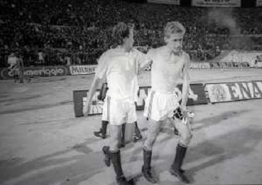 20-04-1988 TORINO SEMIFINALE DI COPPA ITALIA JUVENTUS TORINO 2-1 NELLA FOTO ESULTANZA A FINE GARA GIOCATORI DEL TORINO SILVANO BENEDETTI E KLAUS BERGGREEN AG ALDO LIVERANI SAS
