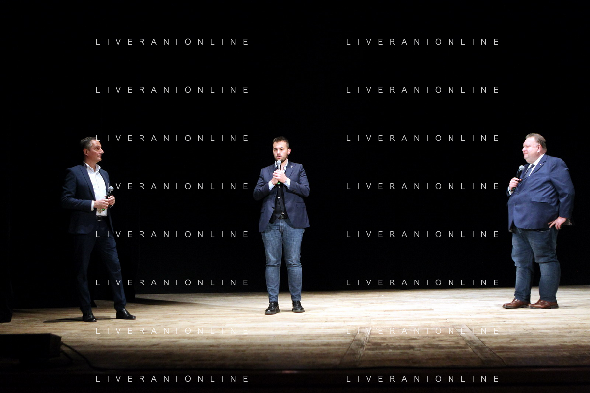 IMOLA 06 12 2021 TEATRO OSSERVANZA GIUSEPPE GIACOBAZZI SPETTACOLO DI BENIFICENZA A FAVORE DELLA FONDAZIONE MONTECATONE ONLUS NELLA FOTO DA SINISTRA GIORGIO CONTI SINDACO MARCO PANIERI E MARCO GASPARRI PRESIDENTE FONDAZIONE MONTACATONE ONLUS FOTO GIANNI SANNA-AG ALDO LIVERANI SAS