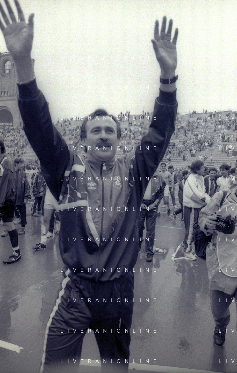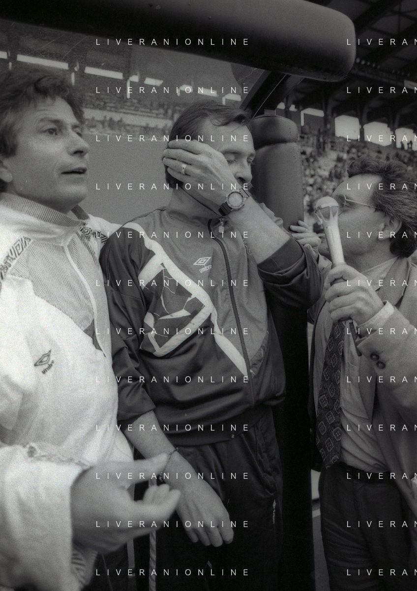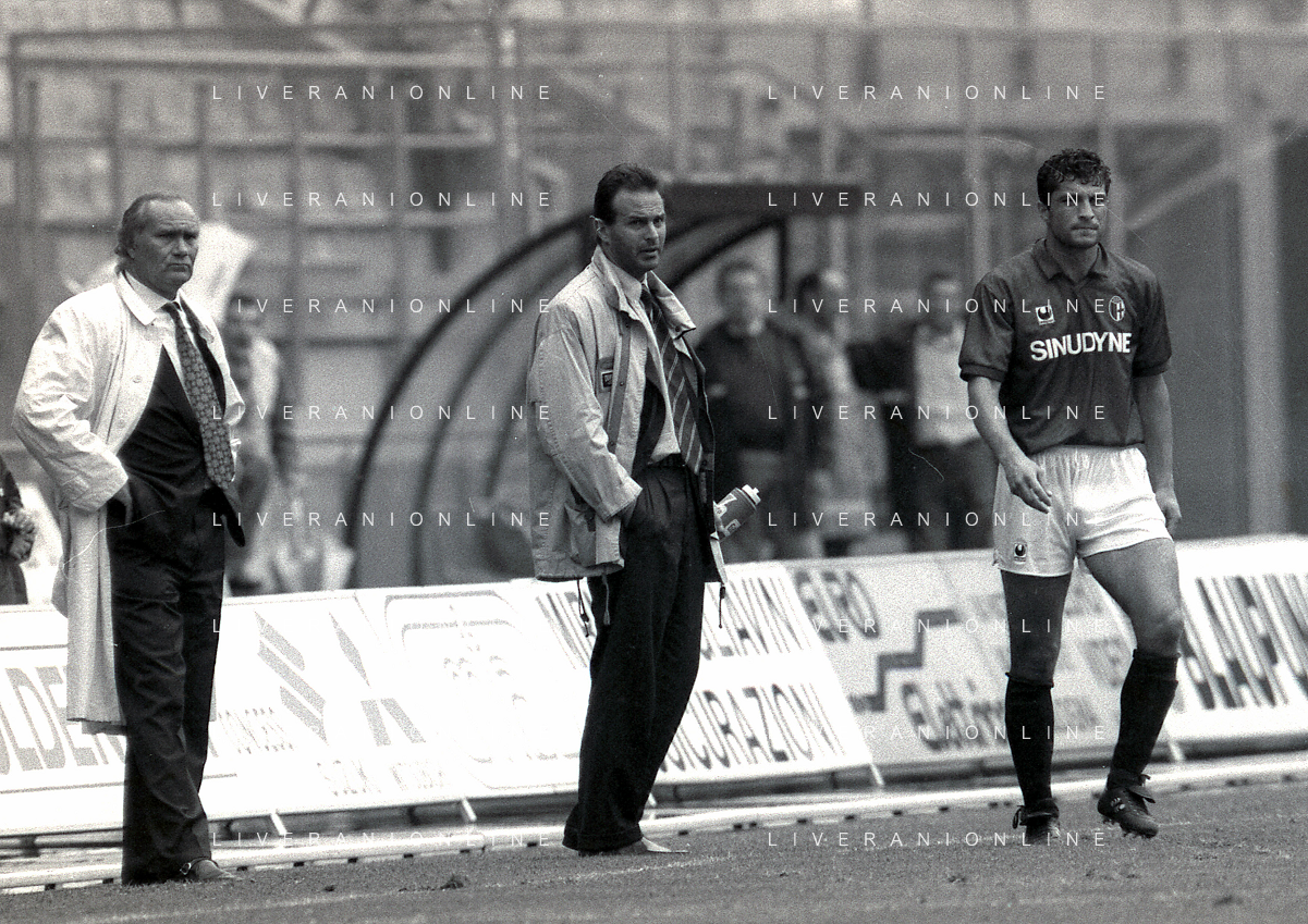 07-06-1992 BOLOGNA CAMPIONATO DI CALCIO SERIE B BOLOGNA-ANCONA 1-1 NELLA FOTO NEDO SONETTI CON ANTONIO CABRINI E KUBILAY TURKYLMAZ AG ALDO LIVERANI SAS