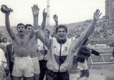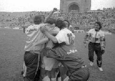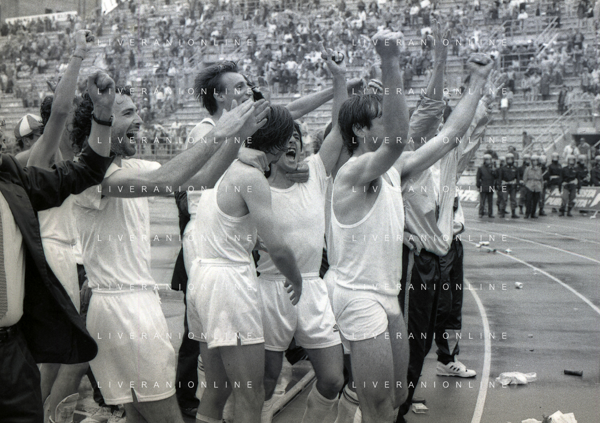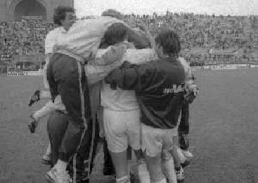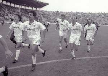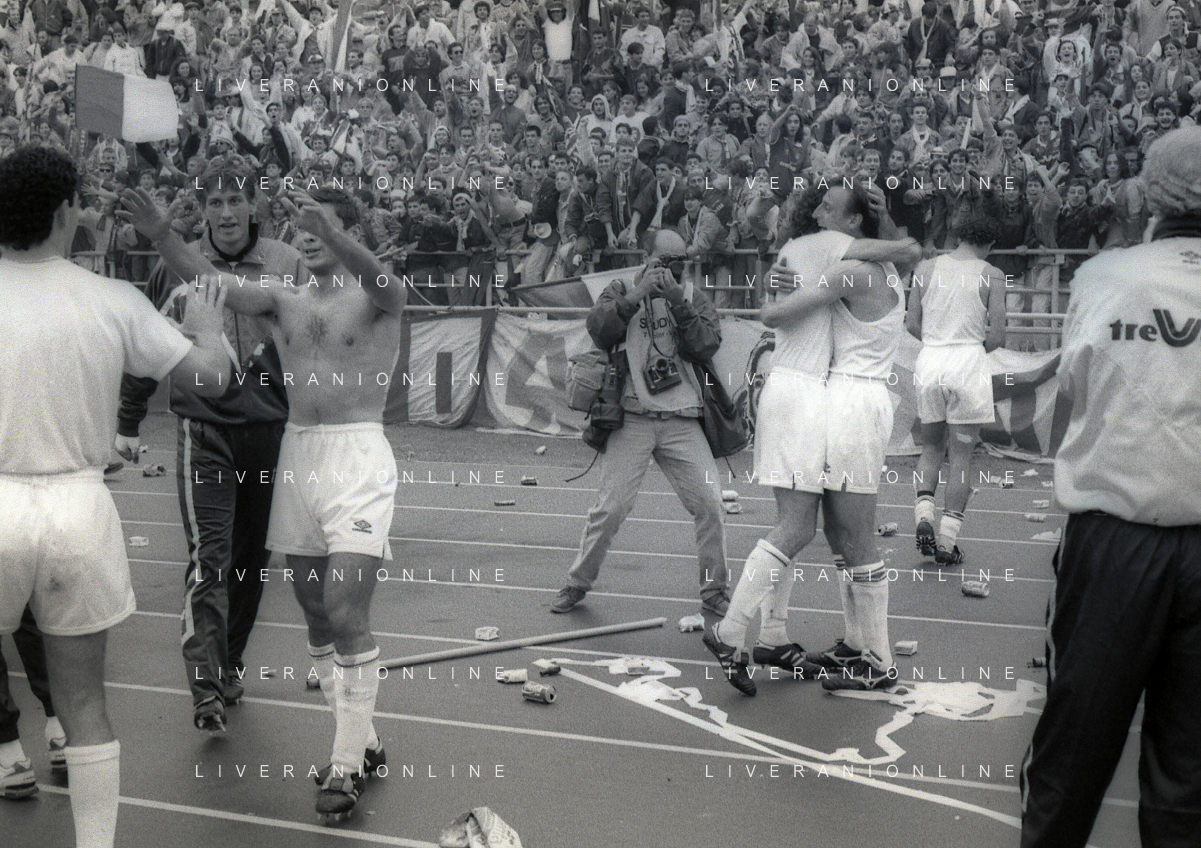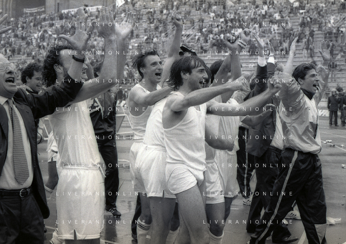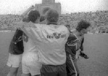 07-06-1992 BOLOGNA CAMPIONATO DI CALCIO SERIE B BOLOGNA-ANCONA 1-1 NELLA FOTO FESTEGGIAMENTI GIOCATORI ANCONA PER LA PROMOZIONE IN SERIE A AG ALDO LIVERANI SAS