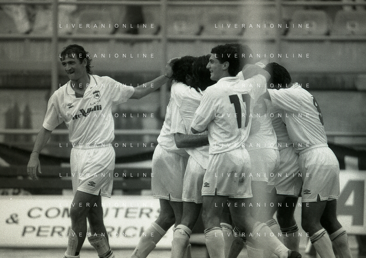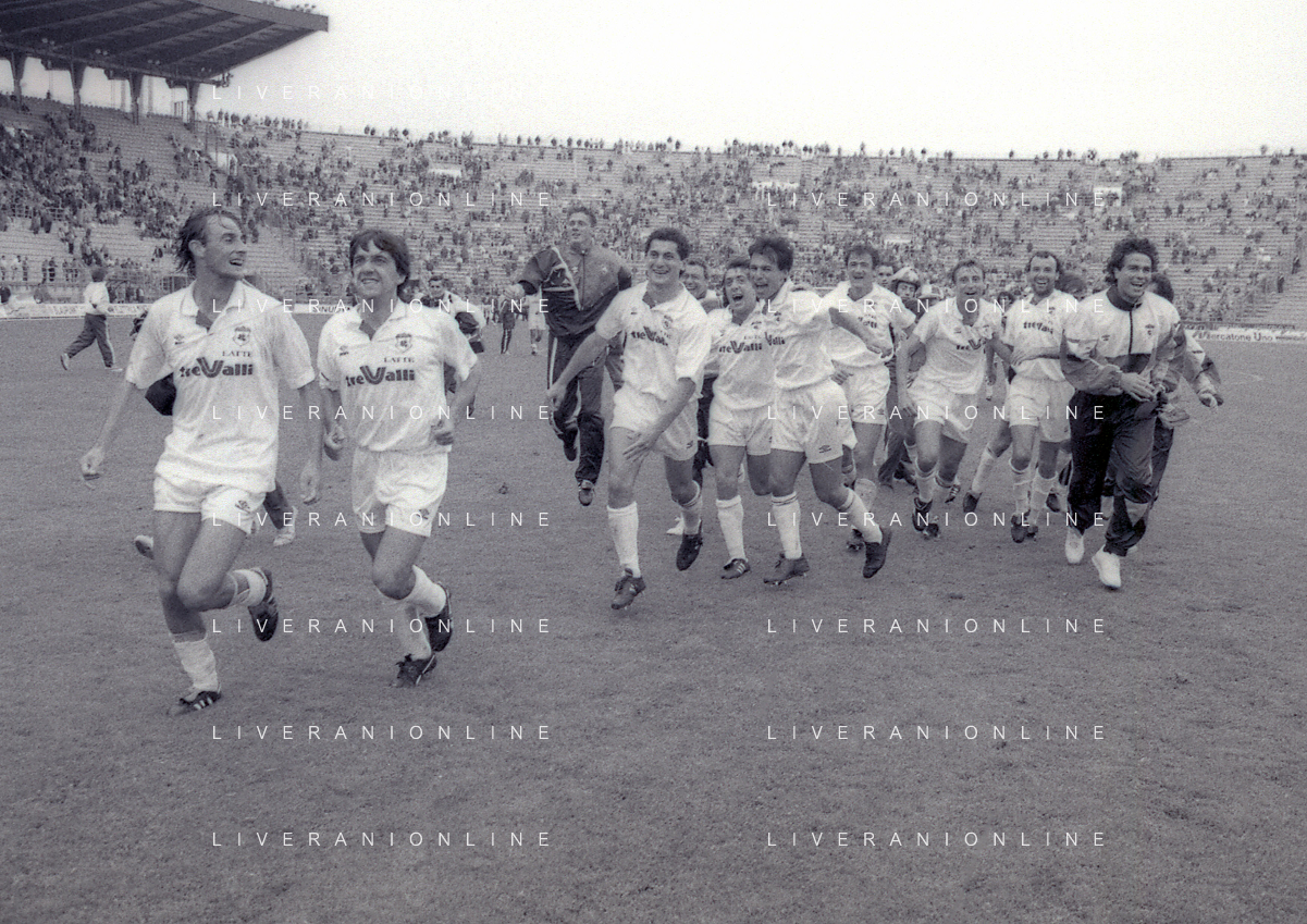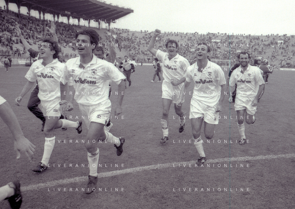 07-06-1992 BOLOGNA CAMPIONATO DI CALCIO SERIE B BOLOGNA-ANCONA 1-1 NELLA FOTO GIOCATORI ANCONA FESTEGGIANO LA PROMOZIONE IN SERIE A AG ALDO LIVERANI SAS